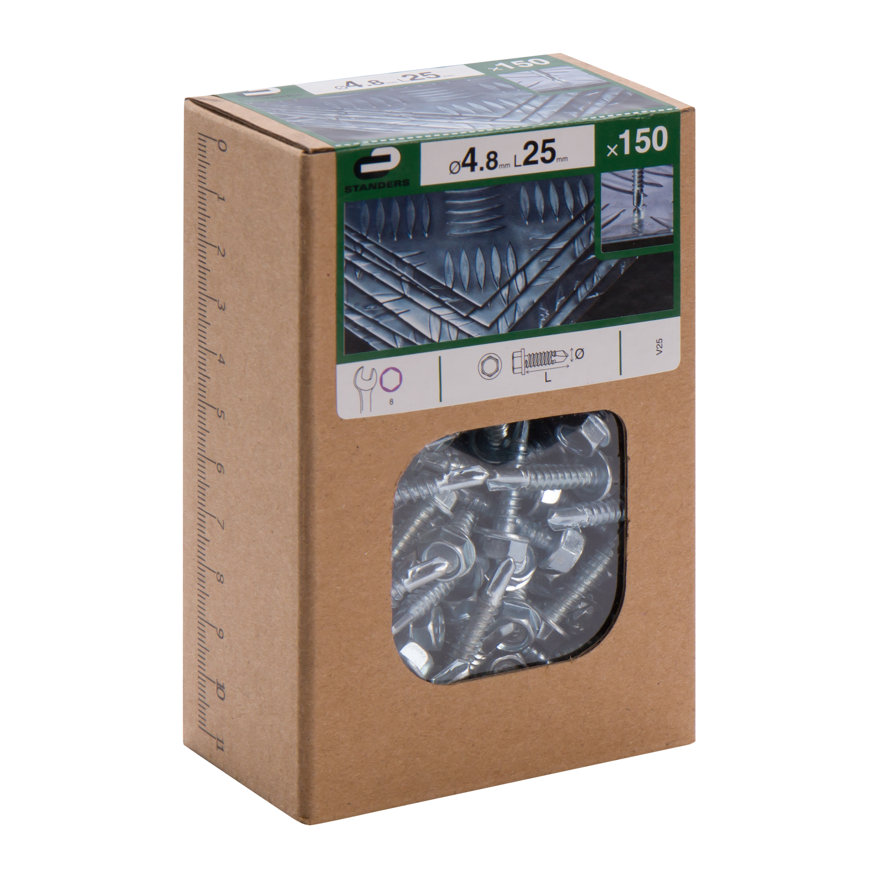 Pack de 150 vis Standers pour métal à tête hexagonale et en acier et finition gris zinc. Conçu pour une utilisation en intérieur. Dimensions : 4,8 x 25 mm (diamètre x longueur).