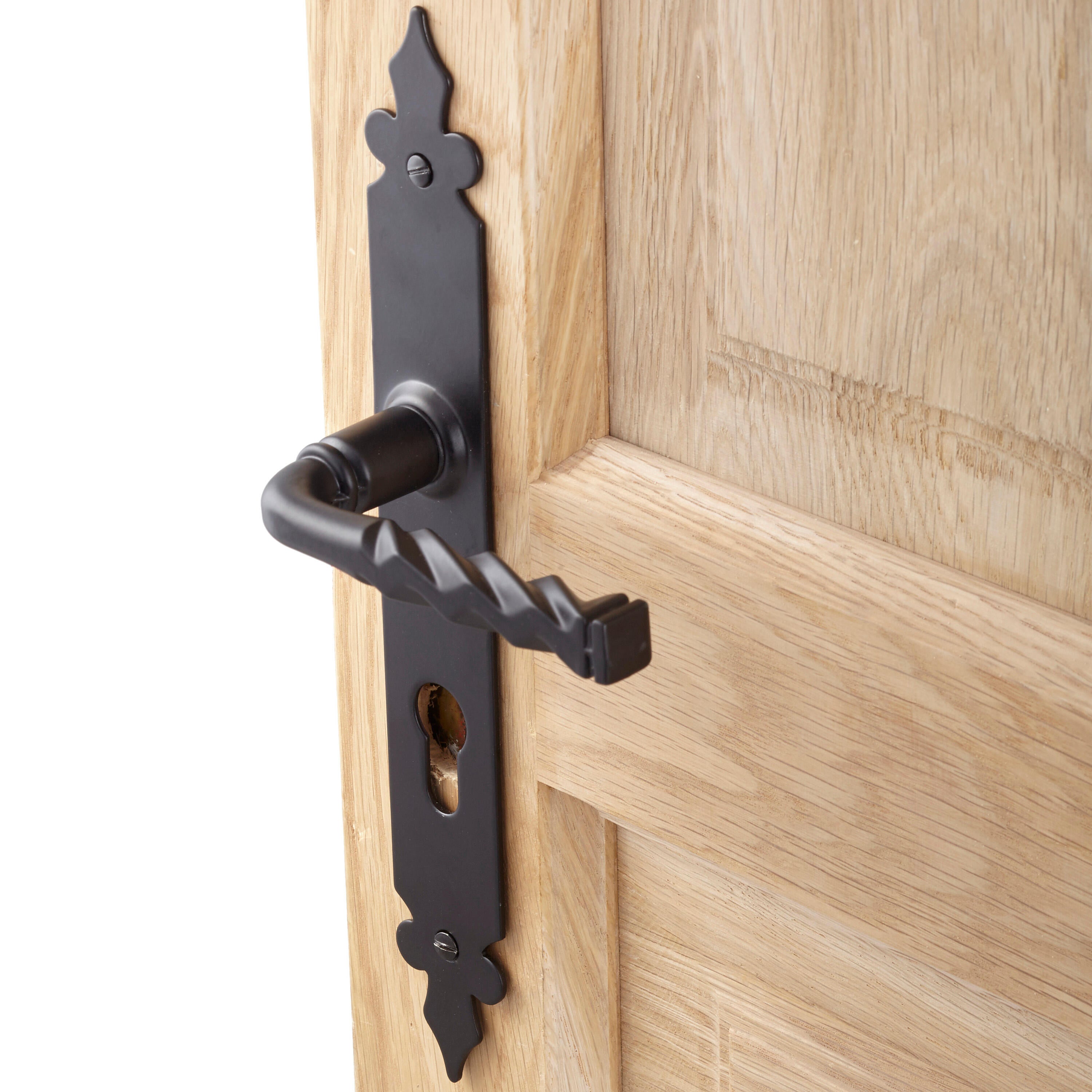 Deux poignées de porte sur plaque avec trou pour cylindre, entraxe de 195 mm.