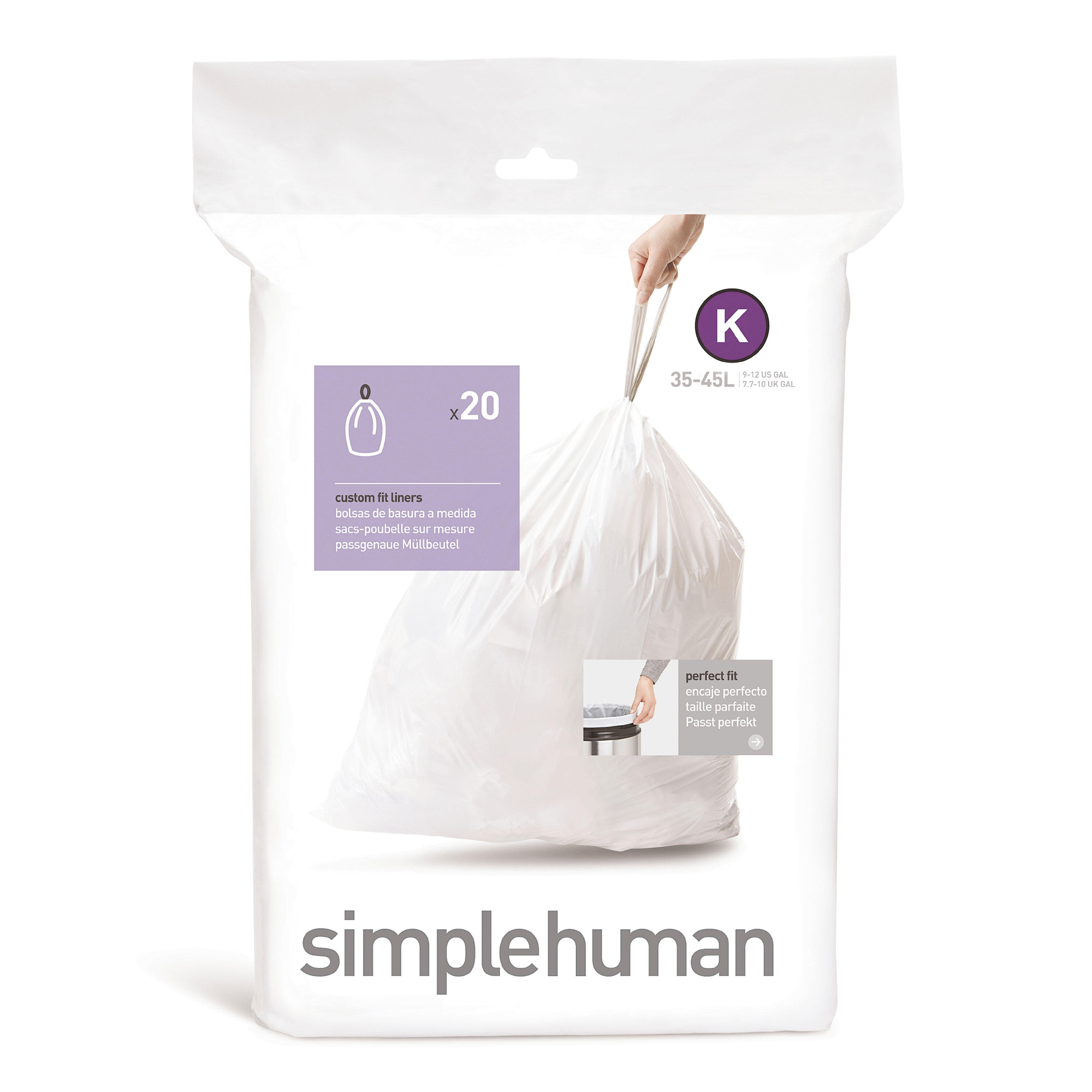 20 sacs poubelle SimpleHuman Code K capacité 35-45 litres. Poignées coulissantes pratiques. Parfaitement adaptés aux poubelles SimpleHuman compatibles avec le code K. Chaque sachet contient 20 sacs poubelle. Coloris blanc.