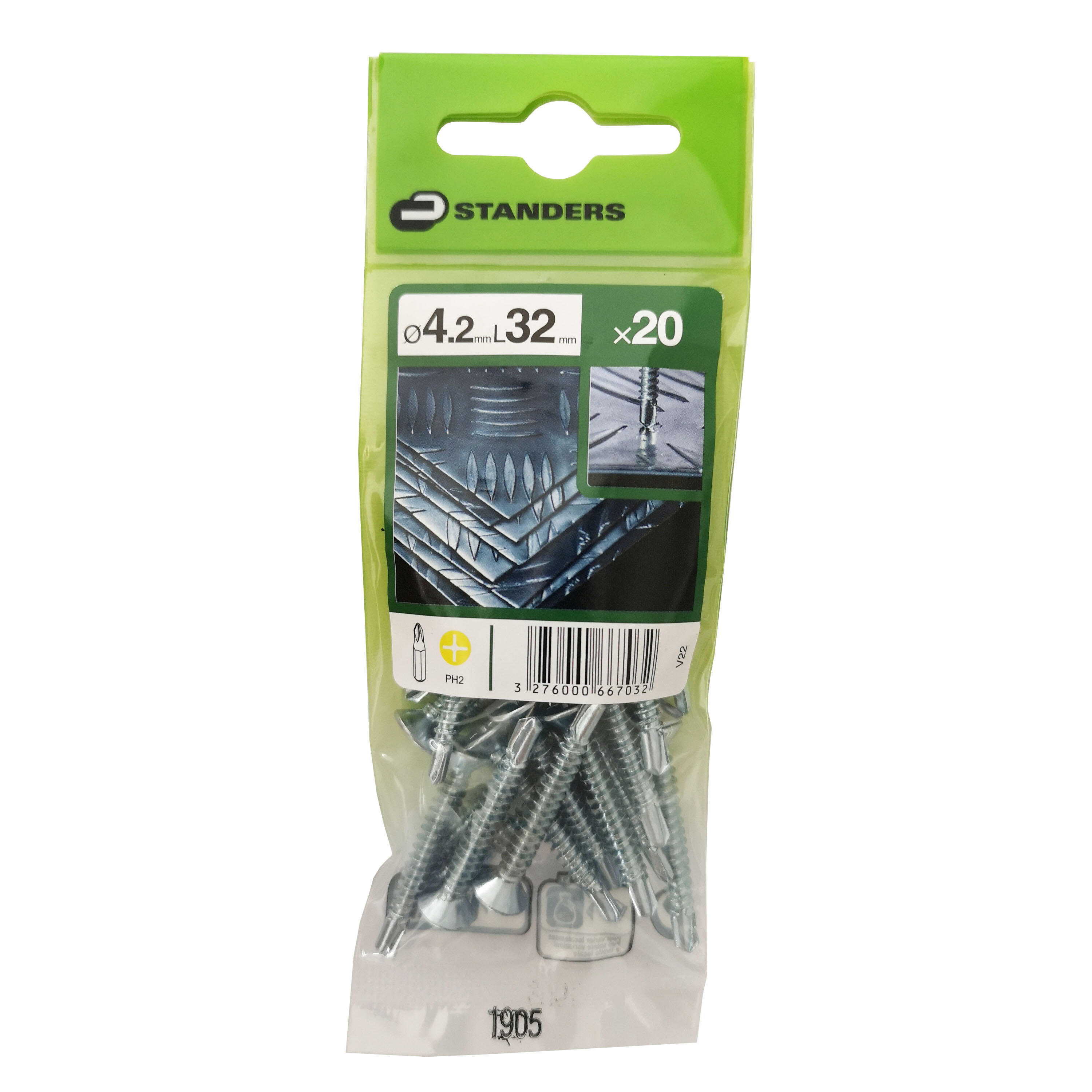 Paquet de 20 vis à métal à tête fraisée Phillips-point Standers en acier zingué. Dimensions : 4,2 mm de diamètre et 32 mm de longueur.