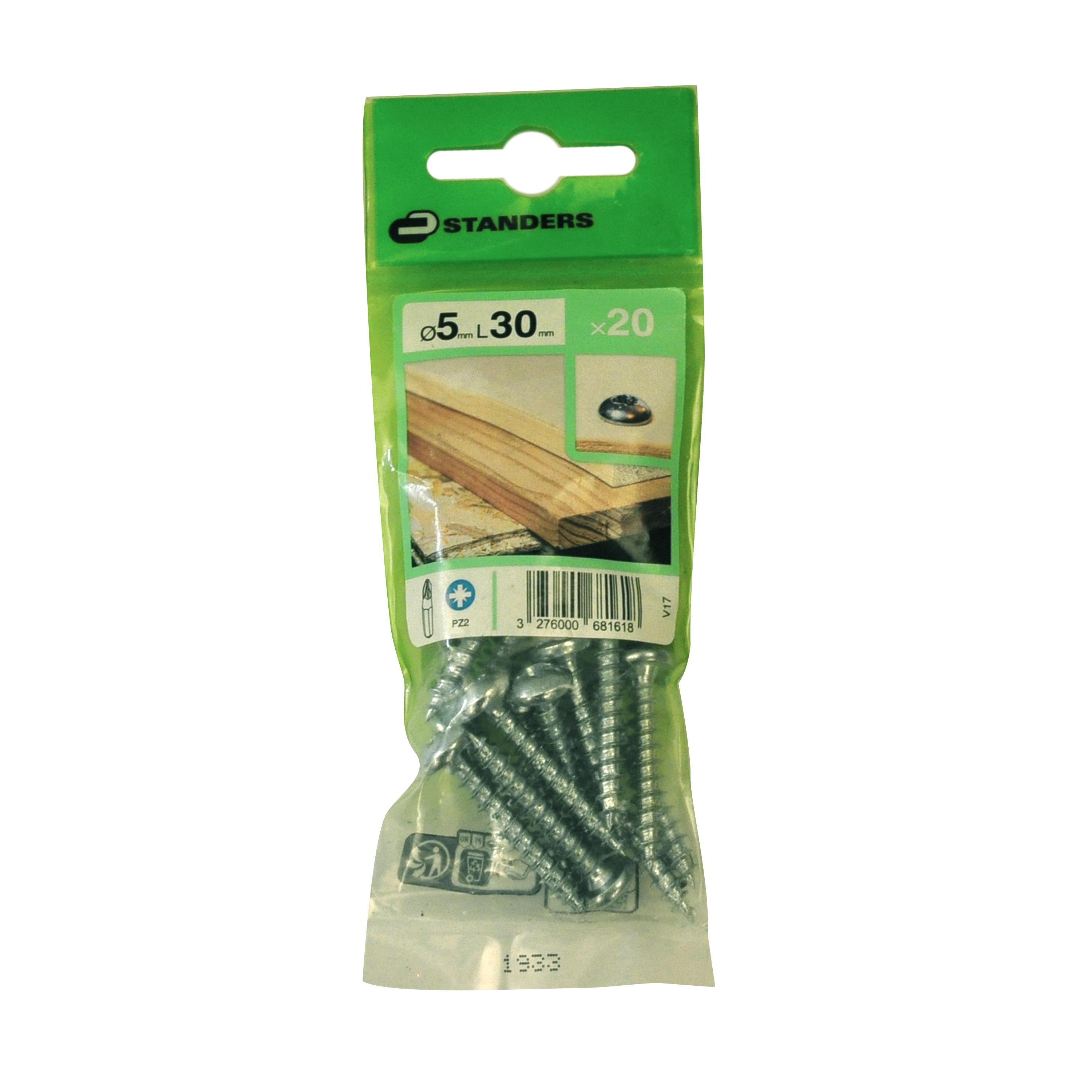 Pack de 20 vis Standers pour bois à pointe Pozidriv et tête ronde, en acier et finition gris zingué. Conçu pour une utilisation en intérieur. Dimensions : 5 x 30 mm (diamètre x longueur).