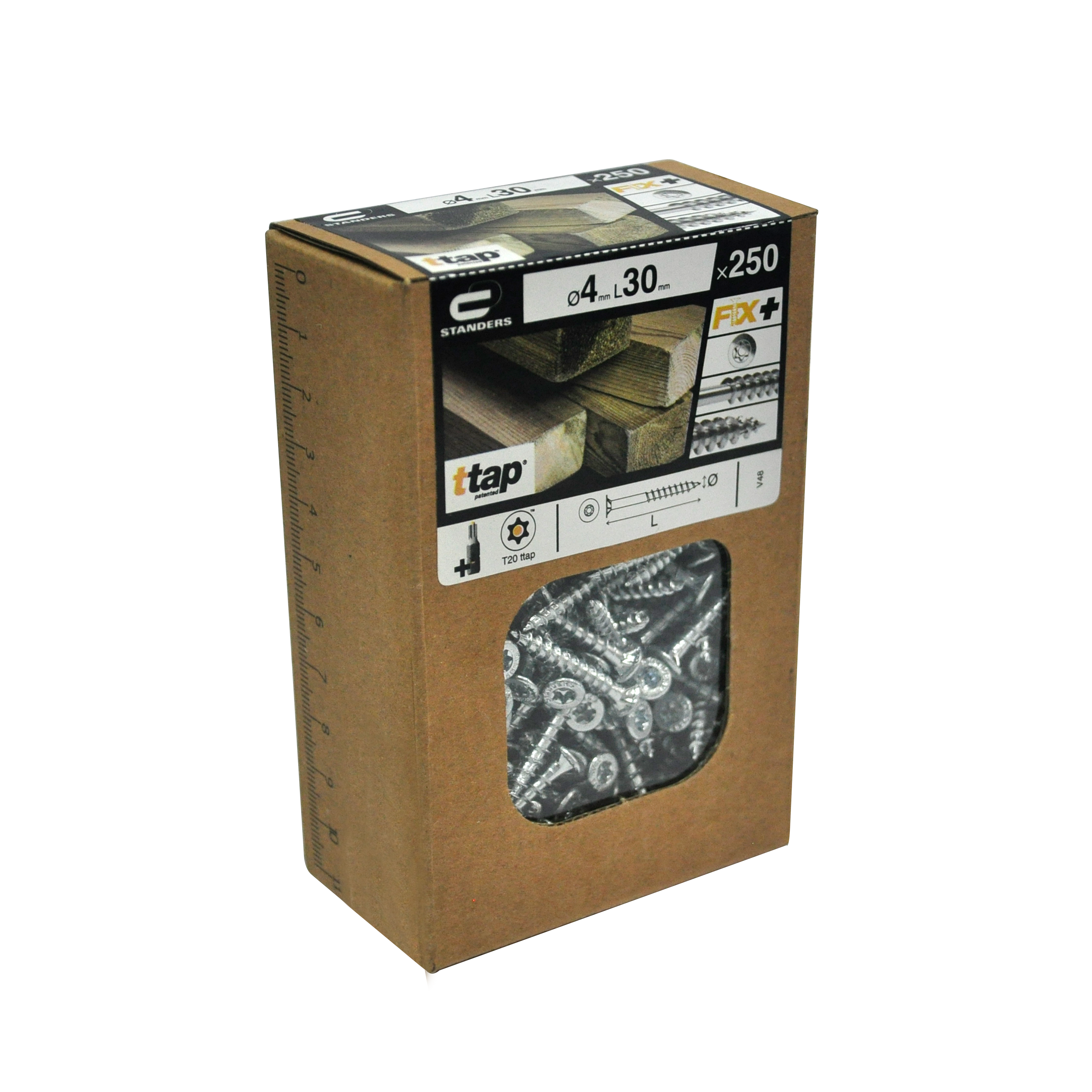Pack de 250 vis Standers à tête fraisée et empreinte étoile pour le bois. Fabriqué en acier avec une finition zinguée. Dimensions : 4 x 30 mm (diamètre x longueur).