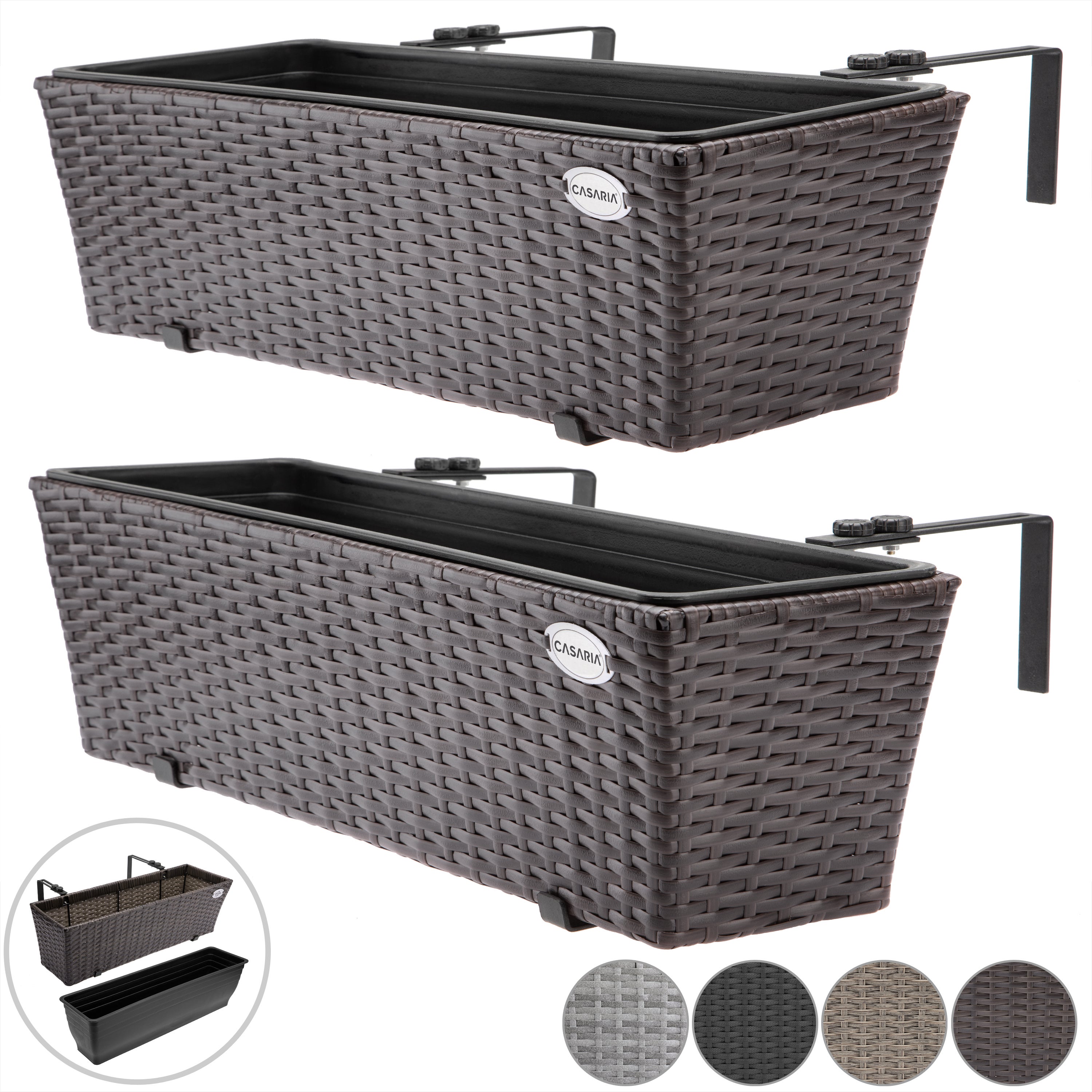 Idéal pour votre balcon ou votre terrasse ! Ce bac à fleurs en polyrotin robuste et résistant aux intempéries est idéal pour installer des plantes sur votre balcon, votre terrasse, dans votre jardin, ou bien pour décorer de fleurs une fenêtre ou une balustrade. La jardinière dispose d'un pot intérieur amovible très pratique. Il peut être utilisé aussi bien à l'intérieur qu'à l'extérieur. Le support de montage inclus en acier galvanisé est réglable de 5 à 14 cm. Remarque : Le fond de la jardinière ne contient pas de trous de drainage, vous pouvez donc en percer facilement afin d'éviter la stagnation de l'eau. Avantages du produit : Convient à l'intérieur et à l'extérieur Support en acier galvanisé Polyrotin robuste Pot intérieur amovible Résistant aux intempéries et aux UV Volume de 11 litres Système de montage réglable inclus Caractéristiques techniques : Dimensions (LxlxH) : 60 x 20 x 19 cm Matériau : plastique Matériau cadre : acier galvanisé Couleur : noir, marron, crème, gris Contenu de la livraison : 2x Bac à fleurs Support de montage