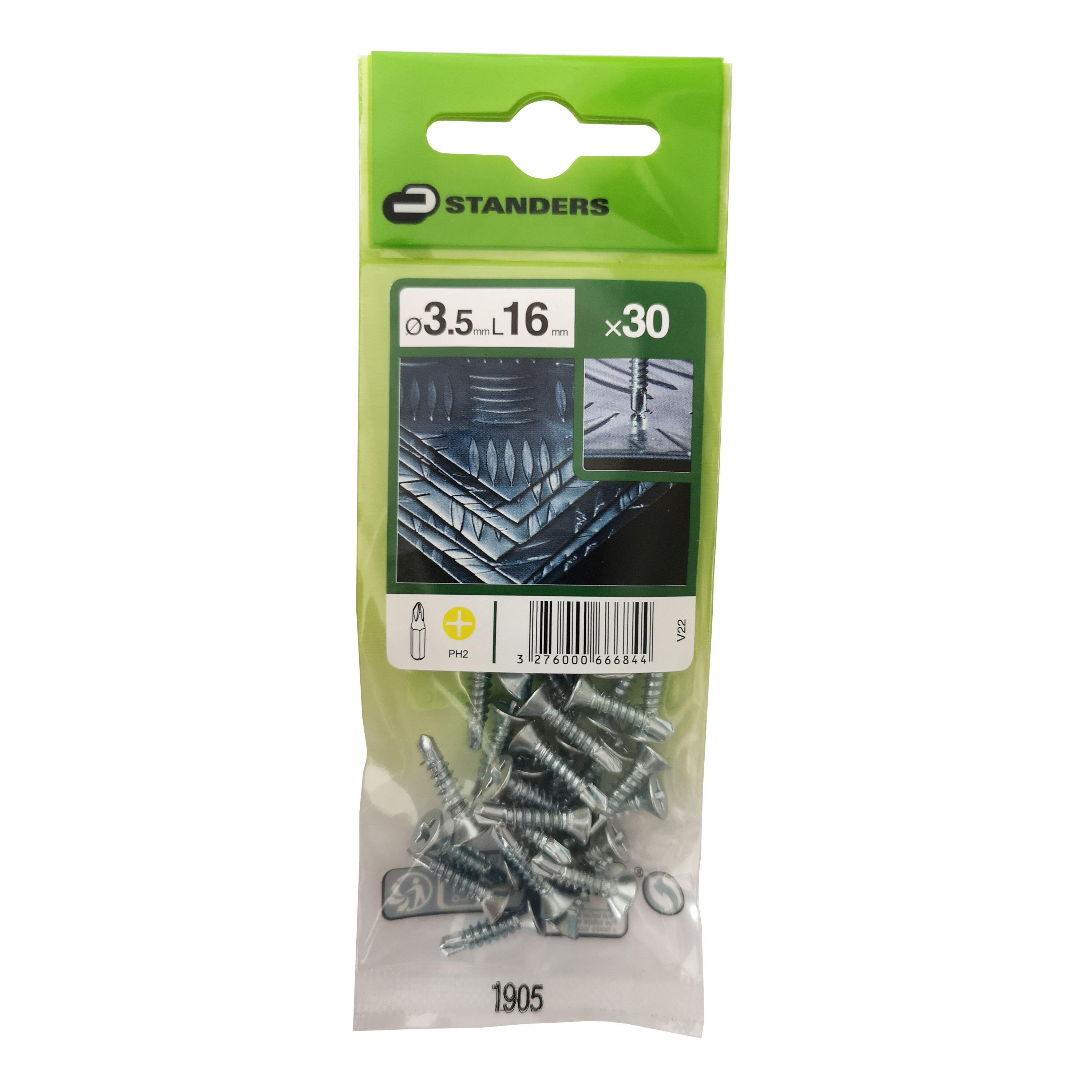Paquet de 30 vis à métal à tête fraisée Phillips-point Standers en acier zingué. Dimensions : 3,5 mm de diamètre et 16 mm de longueur.