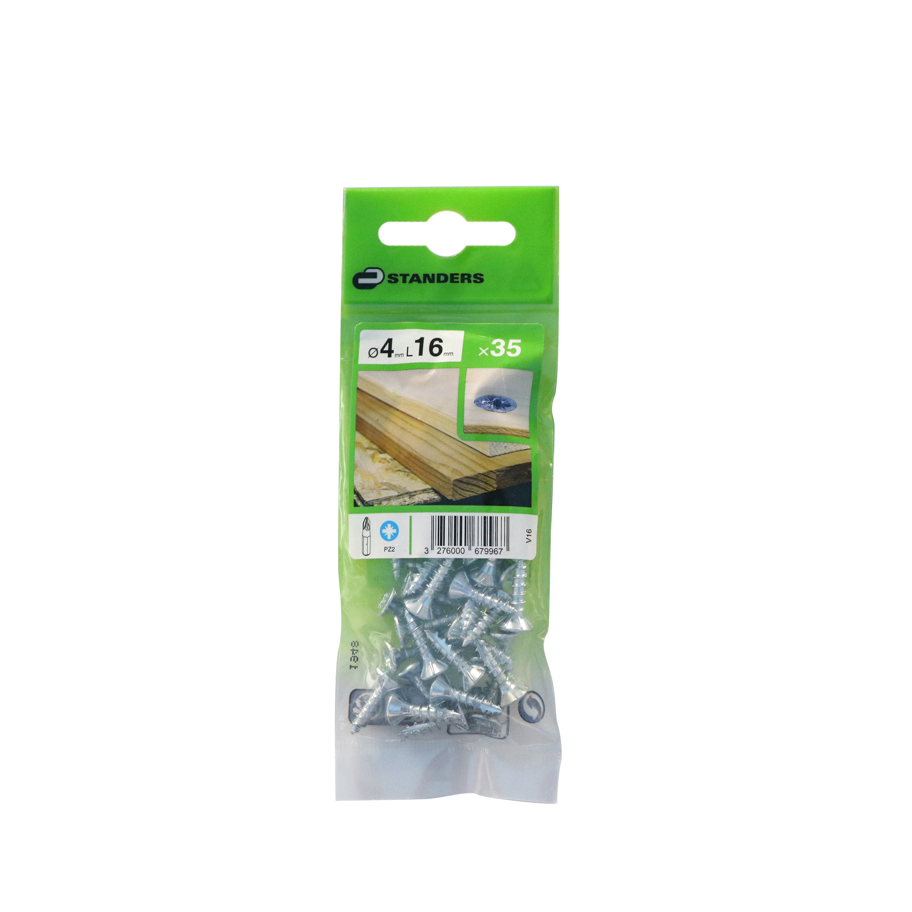 Pack de 35 vis à tête fraisée pozidriv à pointes en acier zingué. Dimensions : 4 mm de diamètre et 16 mm de longueur.