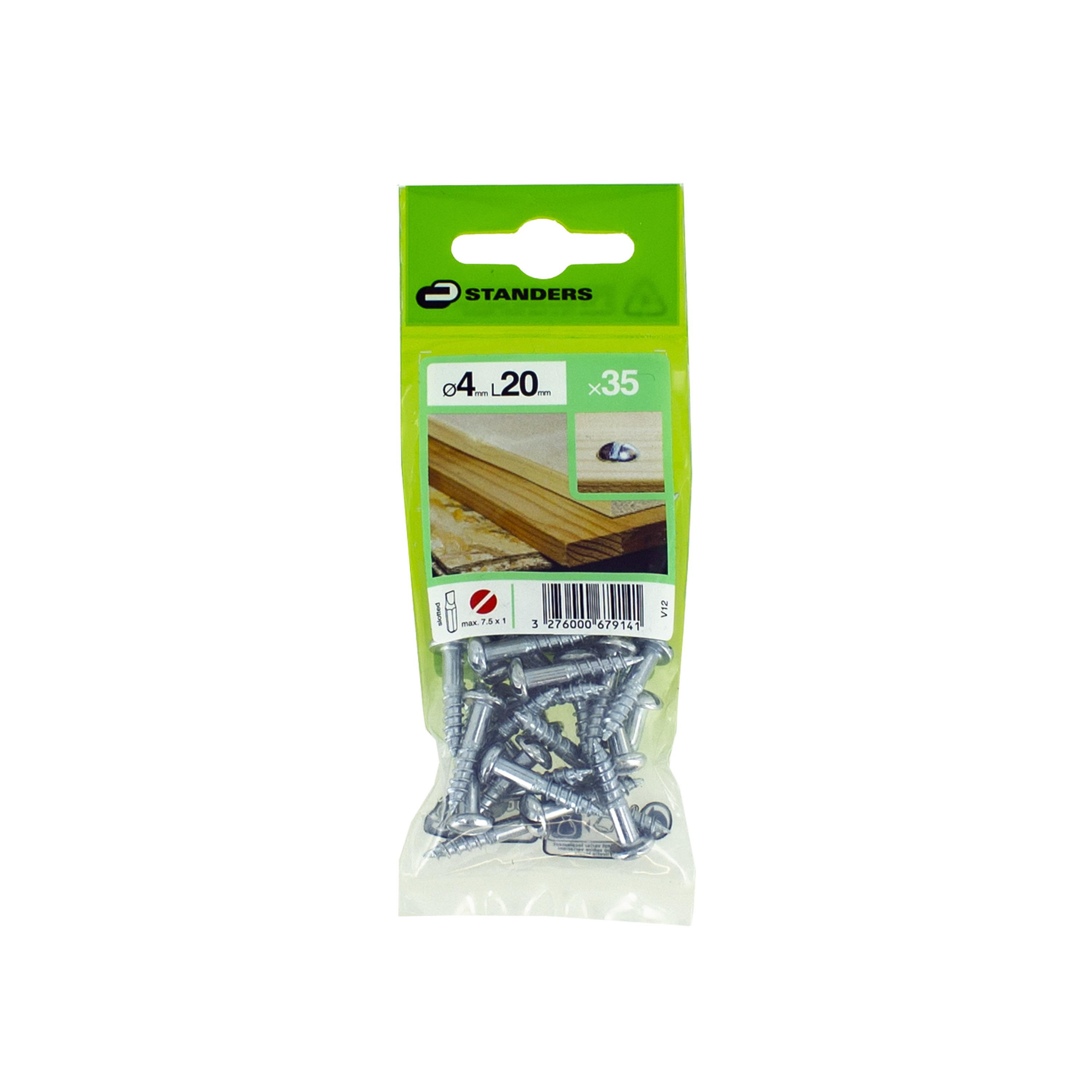 Paquet de 35 vis à bois Standers à tête ronde et empreinte plate, en acier finition grise zinguée. Conçu pour une utilisation en intérieur. Dimensions : 4 x 20 mm (diamètre x longueur).
