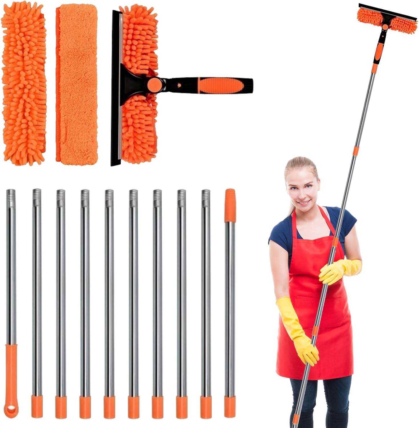 Kit de nettoyage de vitres 2 en 1 : L'ensemble comprend 1 grattoir à vitres, 2 chiffons en microfibre lavables et 10 manches télescopiques. Polyvalent : Avec manche pour nettoyer les surfaces en hauteur, sans manche pour nettoyer les vitres de voiture, etc.