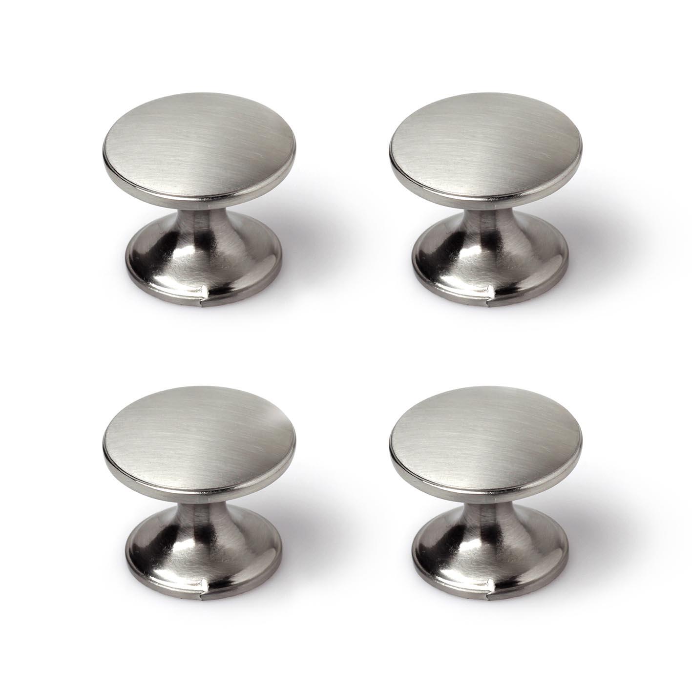 Bouton métallique Ø32mm. en métal zamak nickel satiné. Installation facile, comprend des vis filetées métriques M4 25mm. Dimensions : Longueur 32 x Largeur 32 x Profondeur 27 mm. Contient 4 unités en blister en carton.