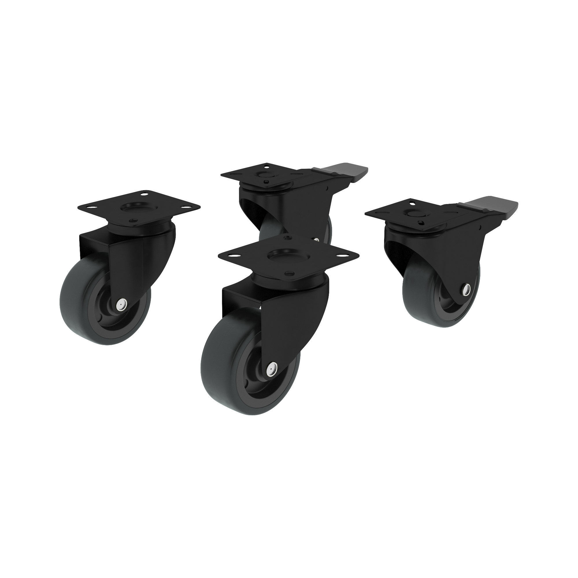 Jeu de 4 roues avec plateau et frein Standers en polypropylène finition noire, fourche en acier et jante en thermoplastique. Il est doté d'un tour de molette et se fixe facilement par vissage. Supporte un poids maximum de 40 kg. Offre 3 ans de garantie. Dimensions : 29 x 50 x 105 mm (largeur x hauteur x profondeur).