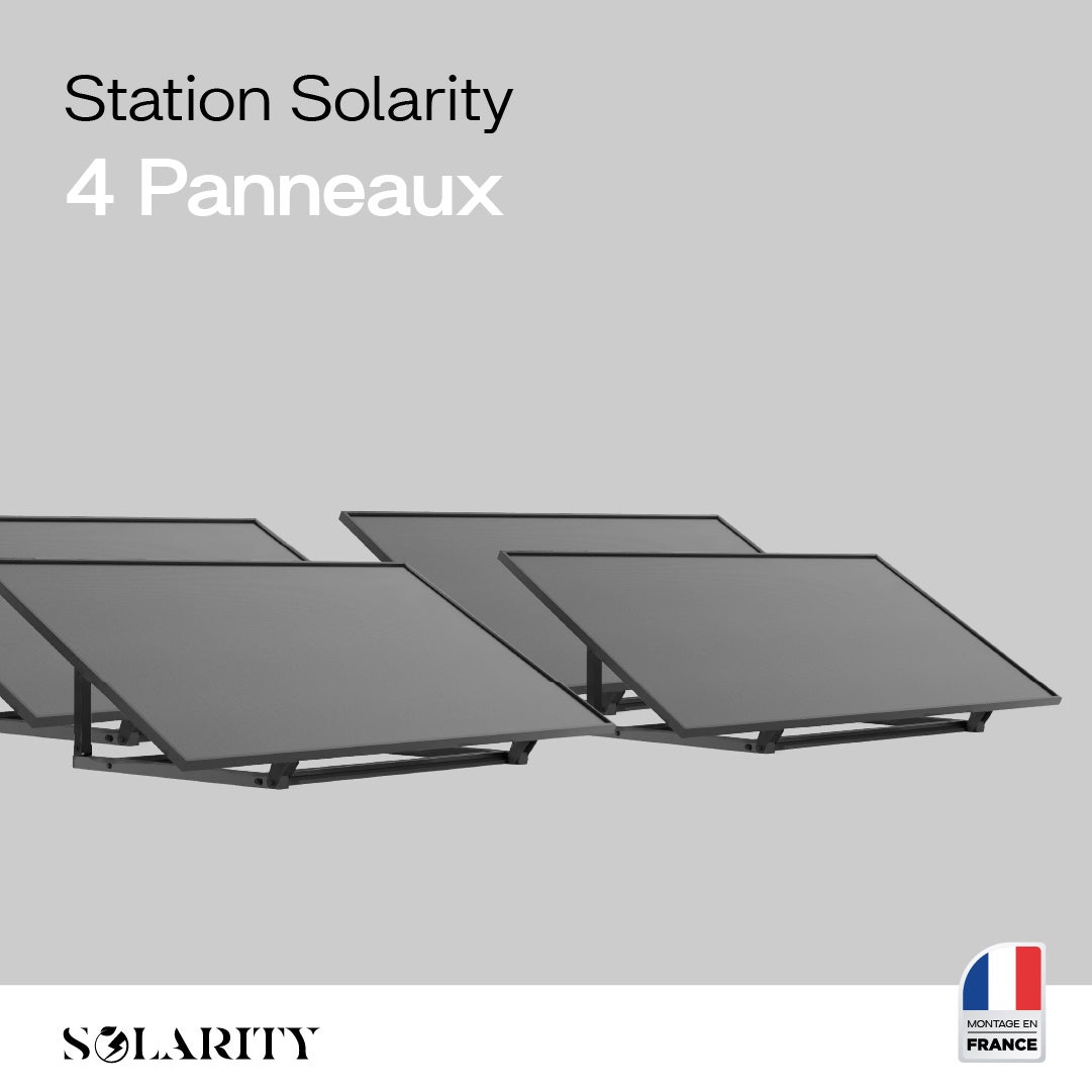 Votre Kit Solarity tout en un, Plug and play. Mise en place seulement en 2 minutes. Garantie à vie Installation possible par nos installateurs Solarity. Votre Kit Solaire Comprenant :Votre Panneau Solaire 400w x4 Votre Onduleur 800w x2 Votre Chassis et connecteur Solarity x4 Votre prise connectée et vos câbles de connexion 400W Plug & Play - Connectez, installez, supprimez ! ⚡ Amortissable en 3 à 6 ans Garantie et performance à vie 🌈 Compact : 1,90m x 1,2m, c'est tout ce qu'il vous faut ! Universel : du studio au manoir, c'est pour tout le monde 🏢🏠 Système modulaire : ajoutez jusqu'à 8 unités pour maximiser les gains 💶 Sécurité totale selon les normes électriques 🛡 Conçu et assemblé en France 🗼 🌟 Solarity Kit, votre partenaire éco-responsable ! 🌟 Peu importe où vous habitez, Solarity Kit vous connecte directement à l'énergie solaire. Deux petites minutes pour l'installer au sol ou sur un mur, et hop, vos dépenses énergétiques diminuent ! 🌞 👉 Zéro administratif. Vous branchez, ça marche. 👉Facile à transporter. Poids plume de 27 kg, il vous convient partout. 👉Économies garanties. Réduisez votre coût énergétique de jusqu'à 87% par rapport au tarif réglementé d'EDF. Et cela, à prix constant pendant toute la vie du produit. Alors, prêt à sauter le pas vers un avenir plus vert ? 🍀