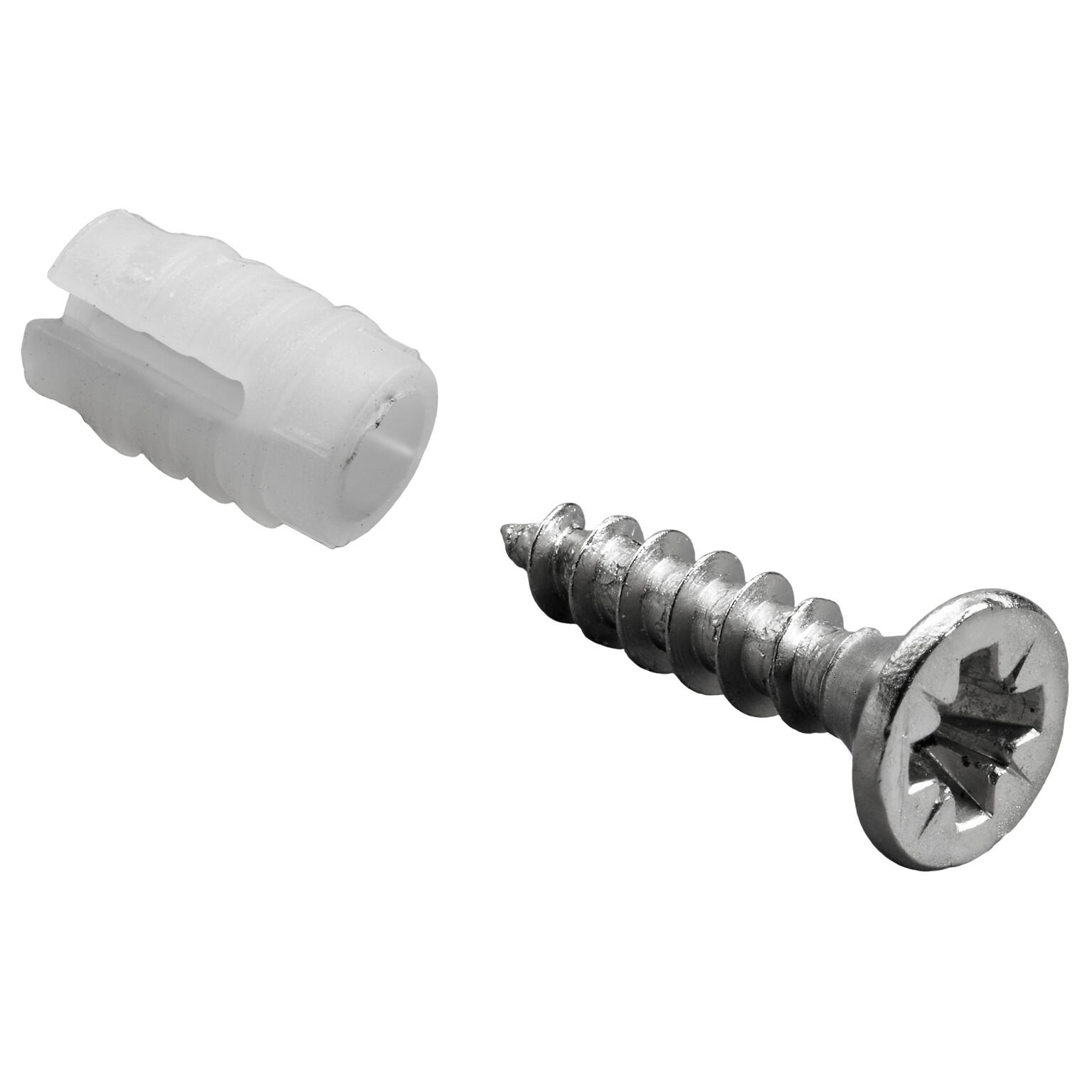 Manchon à expansion en plastique blanc diamètre 5 mm, longueur 9 mm. Vis de fixation en acier nickelé, diamètre 3.5 mm et longueur 16 mm.