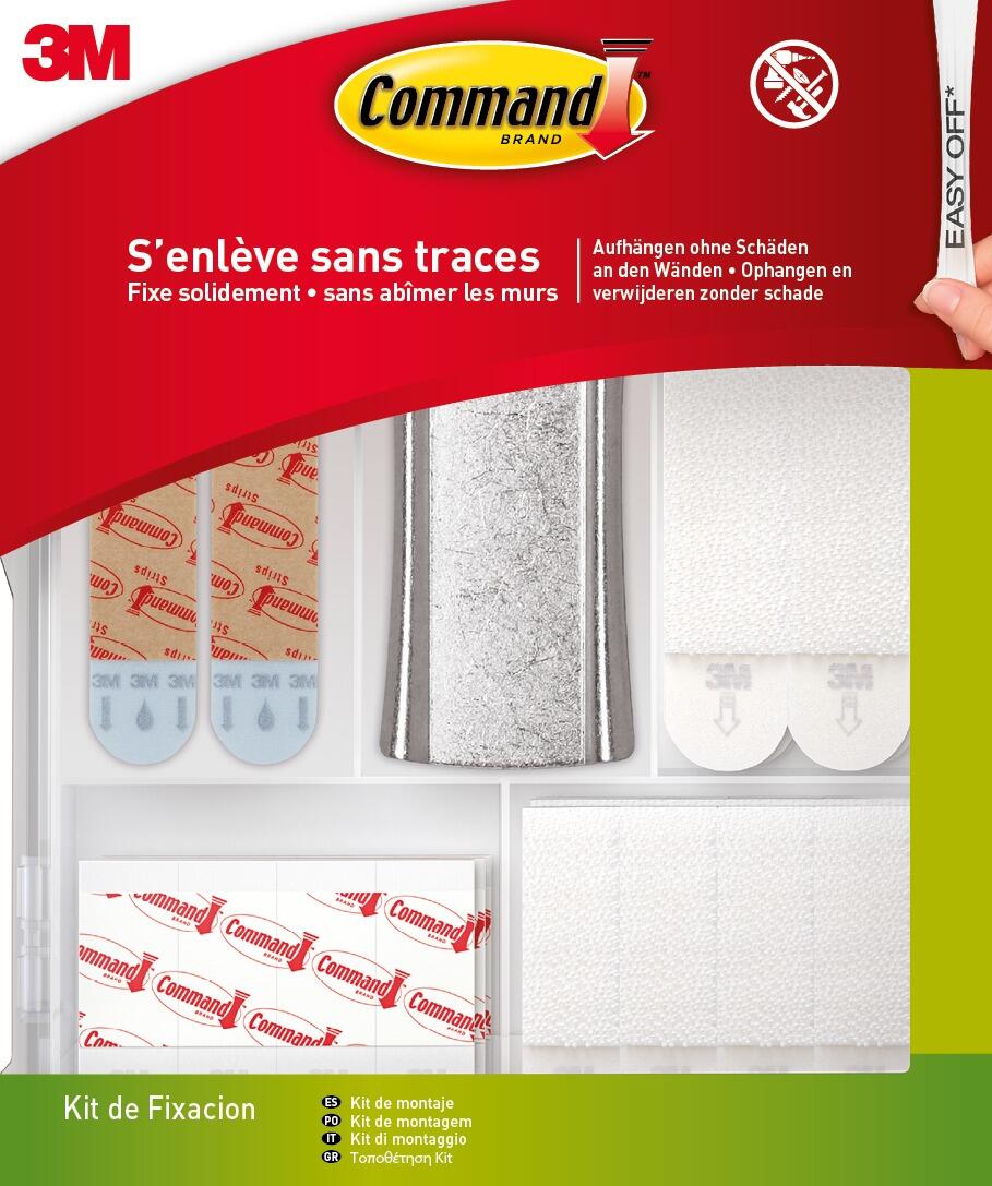 Avec la technologie Command™, oubliez les clous, vis, punaises qui abîment les murs ! Ce kit de solutions de fixation comprend : Languette standard petit modèle x12 Languette tableau petit modèle x16 Languette tableau grand modèle x 12 Languette résistante à l'eau grand modèle x6 Crochet métal tableau petit modèle x2 Ces produits adhésifs Command™ permettent de fixer les objets ou cadres, simplement et solidement, sans outil, sans trou et sans trace, et sur de nombreux supports (carrelage, murs peints, mélaminé, inox ...)
