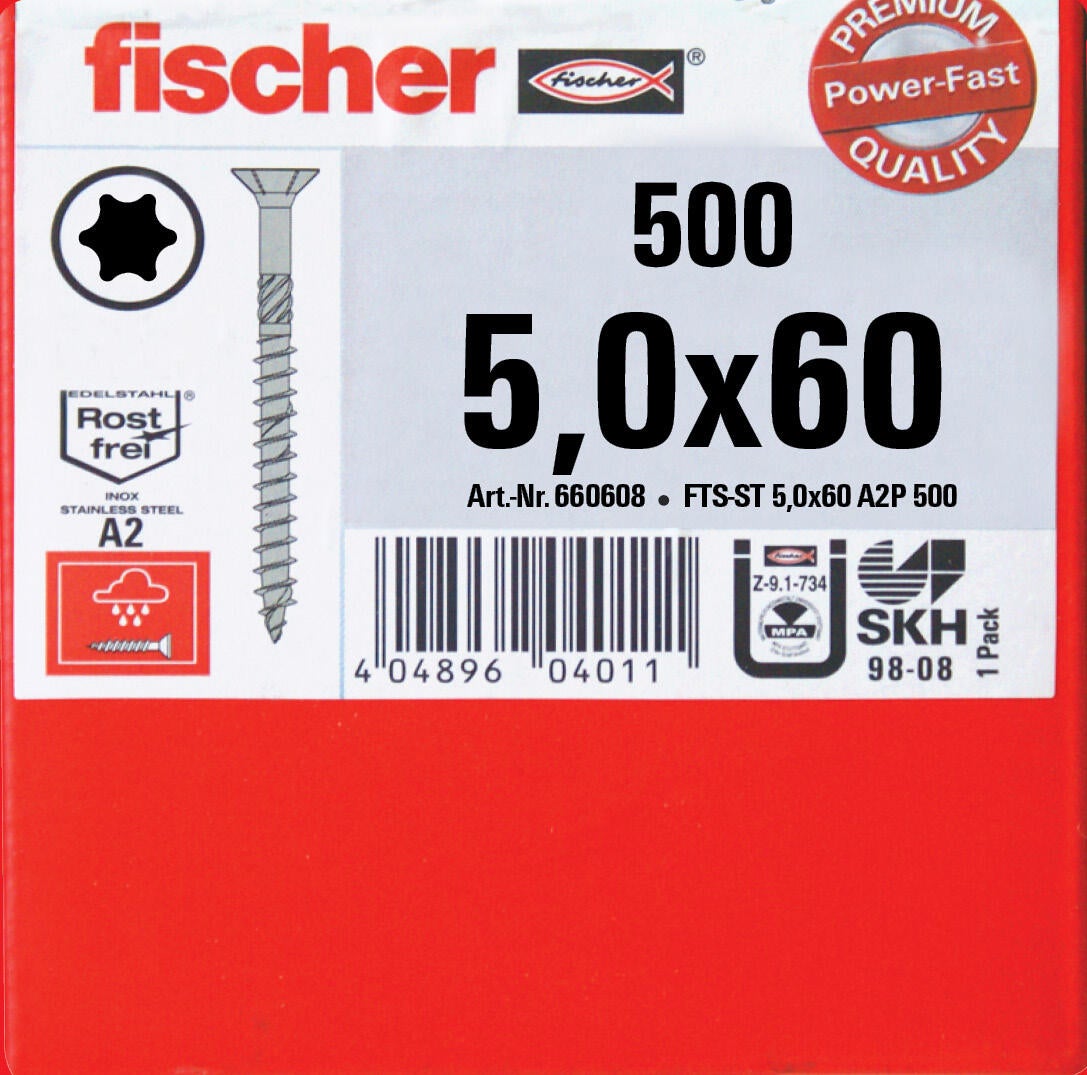 La vis de terrasse A2 Power-Fast FTS-ST A2P est une vis pour la fixation de planches de terrasse sur ossatures bois. La vis en acier inoxydable A2 avec filetage partiel, tête fraisée plate et empreinte étoile peut être utilisée dans un grand nombre de bois pour terrasses. Par exemple accoya, bangkiraï, douglas, chêne, IPE, itauba, kapur, mélèze, massaranduba et robinier.