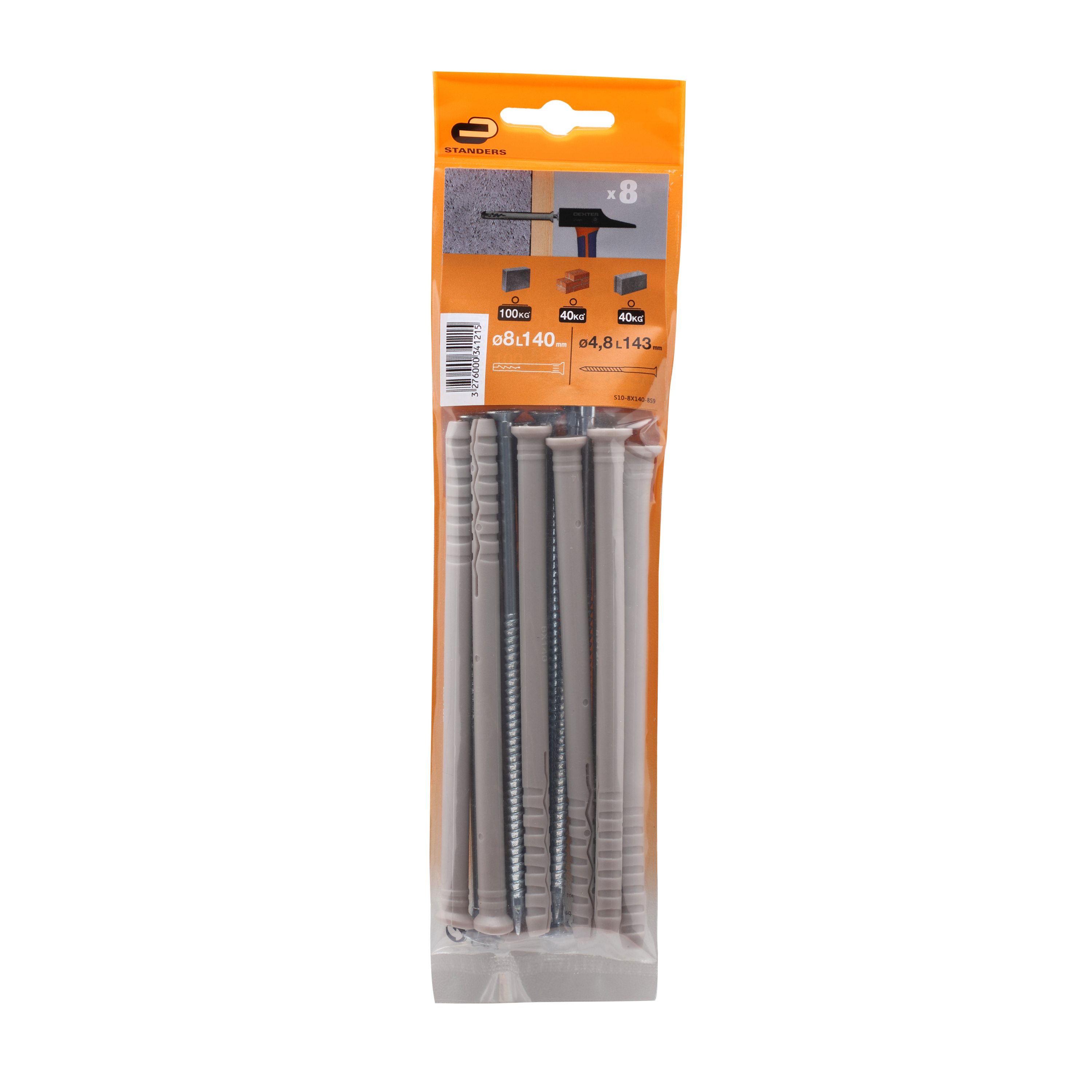 8 chevilles à frapper (brique, béton, parpaing) STANDERS, Diam. 8 x L.140 mm