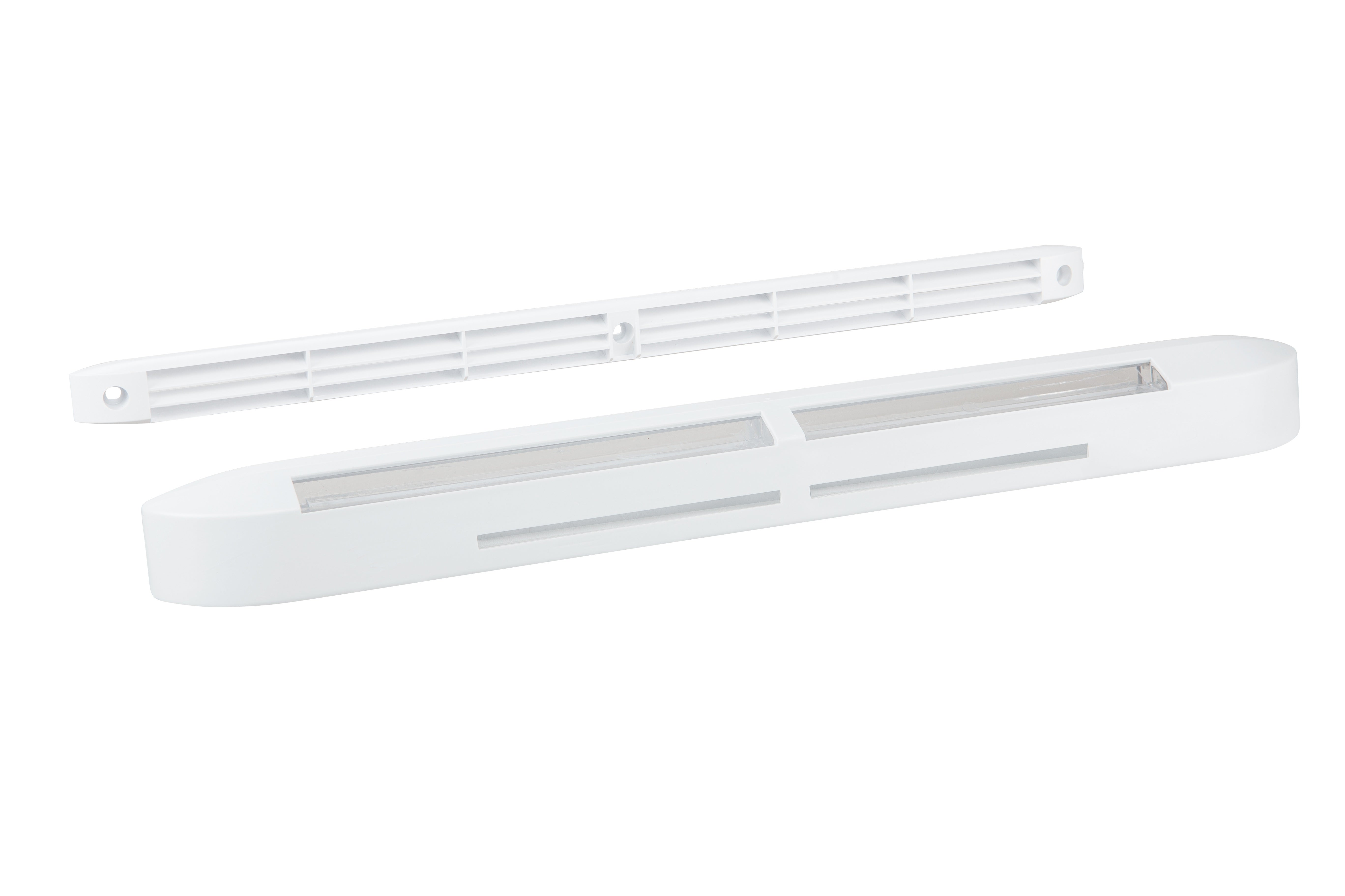 Entrée d'air hygroréglable acoustique, de 6 à 45 m3/h, couleur BLANC, réservation 354x12 mm, avec capuchon extérieur en polystyrène résistant aux UV. Installation dans les pièces principales (séjour et chambres) pour l'amenée d'air neuf des systèmes simple-flux en ventilation mécanique hygroréglable. Fonctionnement sur parois verticales et tous plans inclinés.