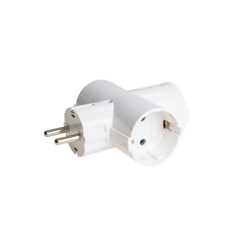 Adaptateur bipolaire blanc avec 3 prises bipolaires, non démontable, fermeture par ultrasons, matériau thermoplastique, puissance maximale admissible 3680W, diamètre des broches de 4,8mm, 16A 250V.