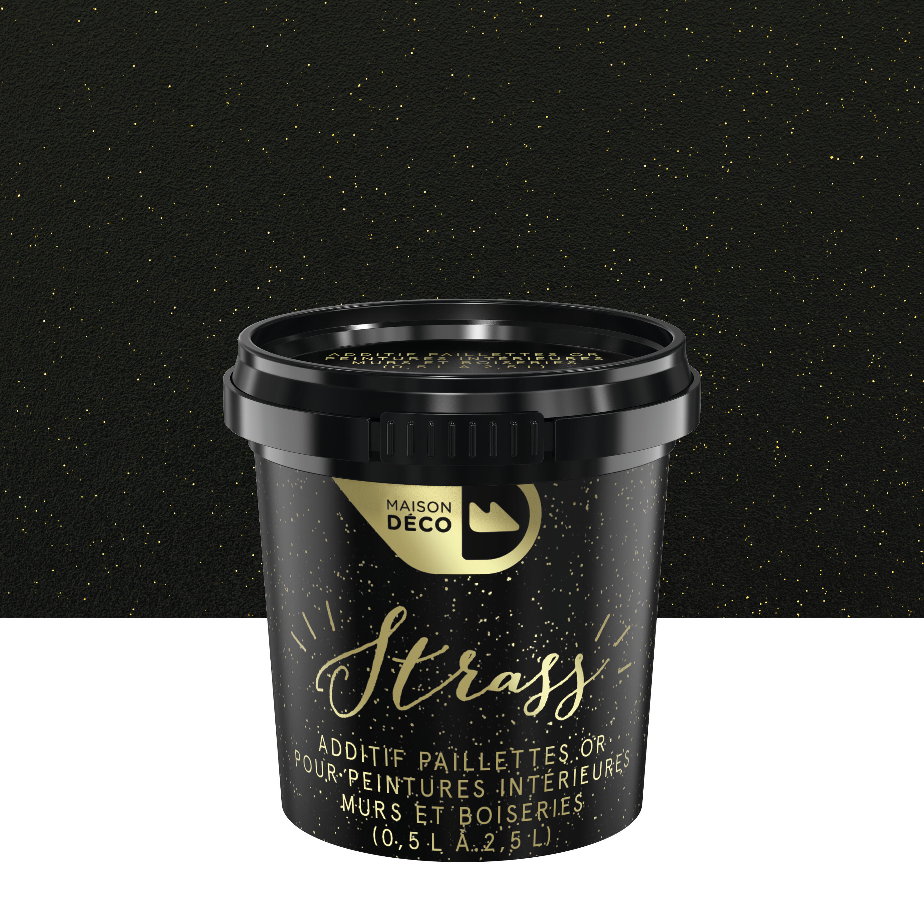 Strass est un additif composé de paillettes. Il est possible de transformer n'importe quelle peinture intérieure satinée ou mate en peinture pailletée. Ces paillettes peuvent s'appliquer sur les murs ou les boiseries. Vous créez votre peinture sur mesure en choisissant la dose de paillettes à ajouter dans la teinte de votre choix ! Son petit format est pratique et se mélange à toutes les peintures à l'eau. Afin de garantir un bel effet pailleté, j’ajoute les paillettes lors de l'application de la dernière couche.