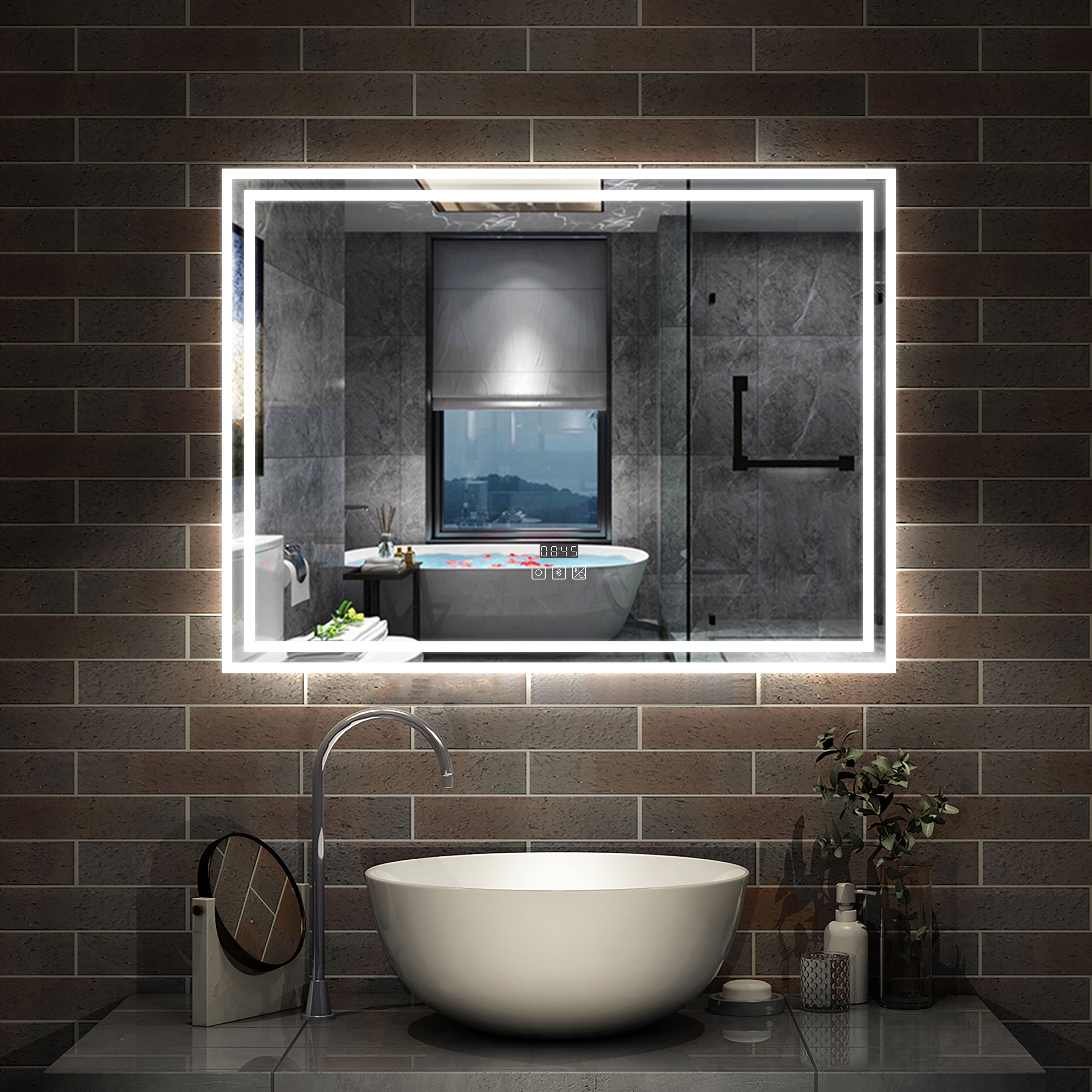 AICA Bluetooth LED 100x60cm tactile + antibuée + horloge miroir salle de bain tricolore, horizontalement