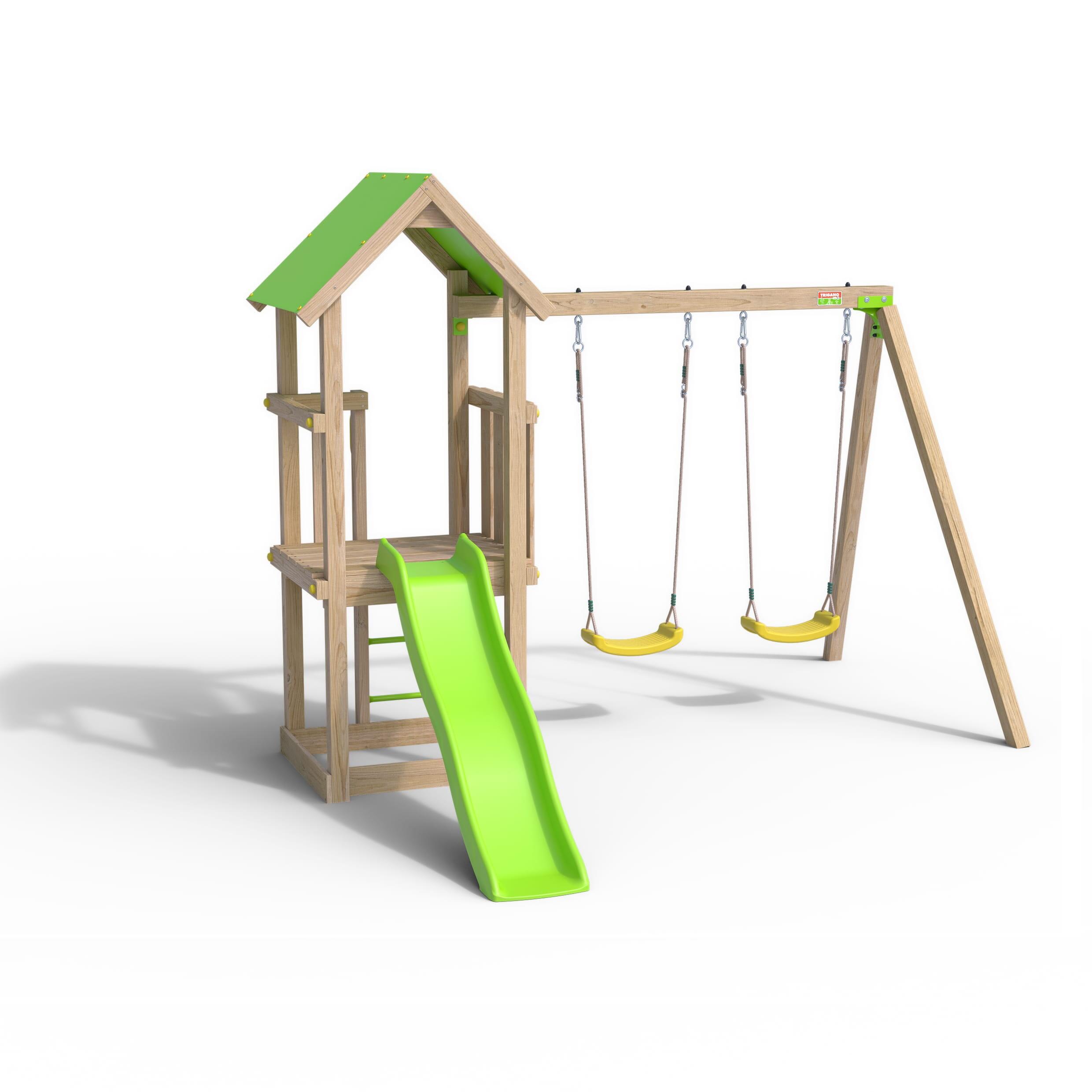 Station de jeux en bois EASY XPERIENCE pouvant accueilir jusqu'à 6 enfants. Extension portique composée de deux balançoires soufflées réglables en hauteur, coloris jaune. Hauteur du portique 1,90 m. Plateforme en bois hauteur 90 cm avec gardes corps pour une protection renforcée et 3 échelons métal coloris vert. Toboggan de 1,73 m de glisse. Toit en bâche PVC, traité anti-UV, coloris vert . Bac à sable dimensions : 80 x 60 cm. Liaison pieds/poutre : pièce de jonction métal coloris vert . Poignées en plastique coloris jaune. Age recommandée : 3 à 8 ans. Scellement béton ou sécur'in impératif. Caractéristiques techniques : pin sylvestre traité autoclave classe IV. Section de la poutre : 9 x 9 cm, section des pieds : 7 x 7 mm, section des montants : 70 x 45 mm, section des planches : 120 x 20 mm.