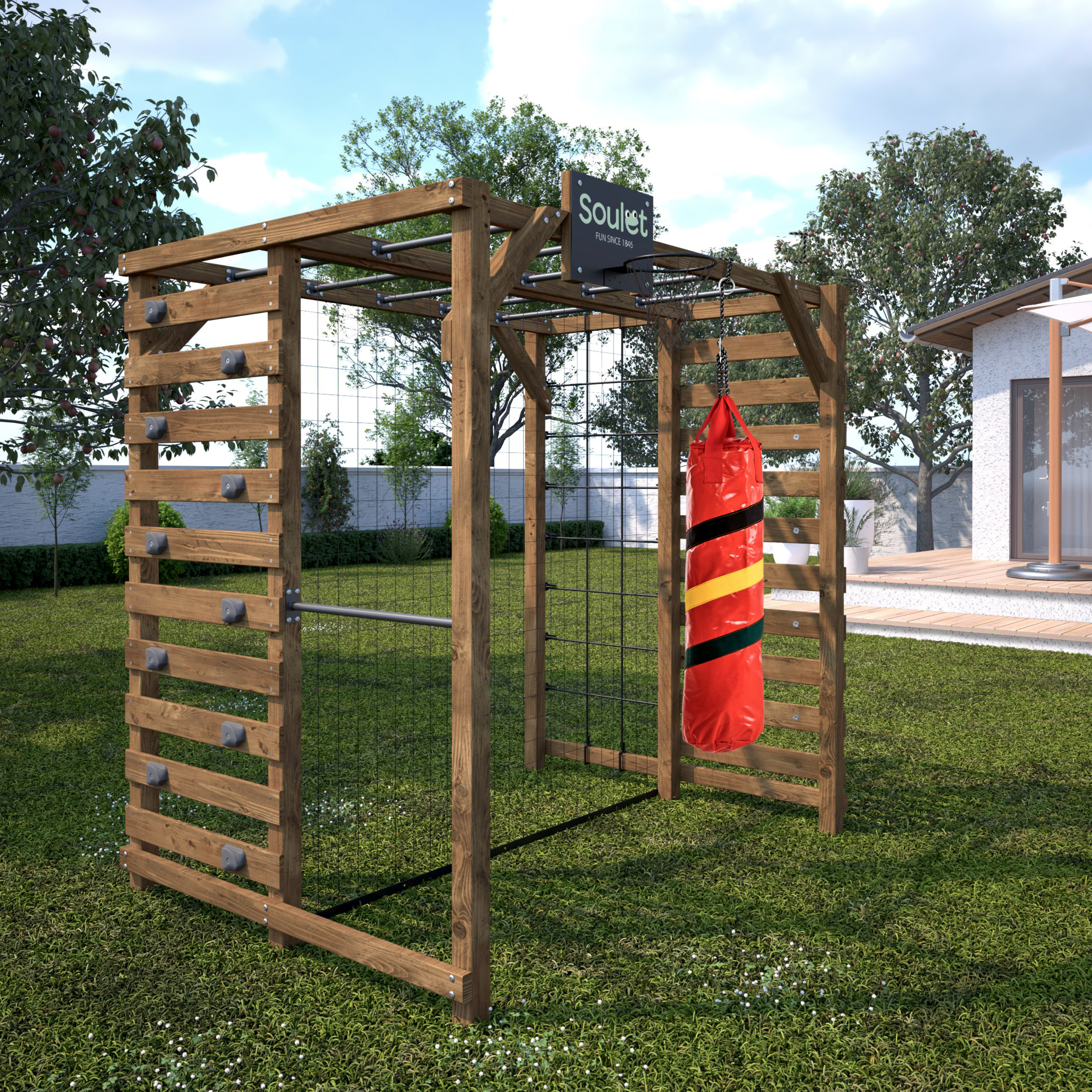 Odin, une aire de jeux compacte pour les joueurs sportifs et intrépides qui aiment se dépenser au jardin ! Avec 2 murs d'escalade, 2 rangées de barre de singe, 1 barre à roulades, 1 filet de foot, 1 sac de boxe noir et 1 mini panier de basket Cette aire de jeux en bois prend la forme étonnante d’un cube d’activités qui regroupe un ensemble d’éléments sportifs. Le plus difficile sera de choisir ! Avec une structure en bois traité autoclave classe 4 pour une longévité garantie.