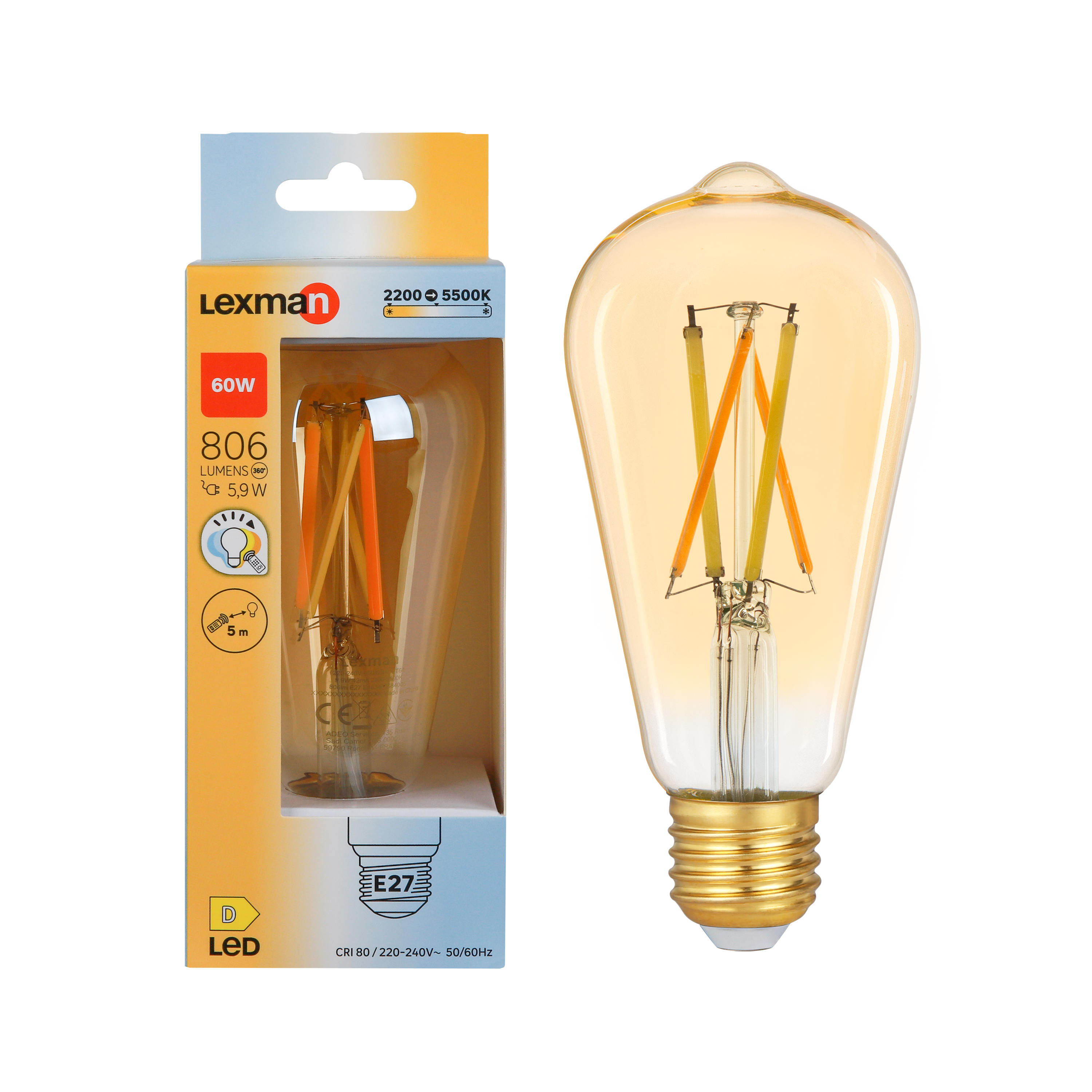 Ampoule led à télécommande, Edison E27, 806lm = 60W, variation de blancs, LEXMAN