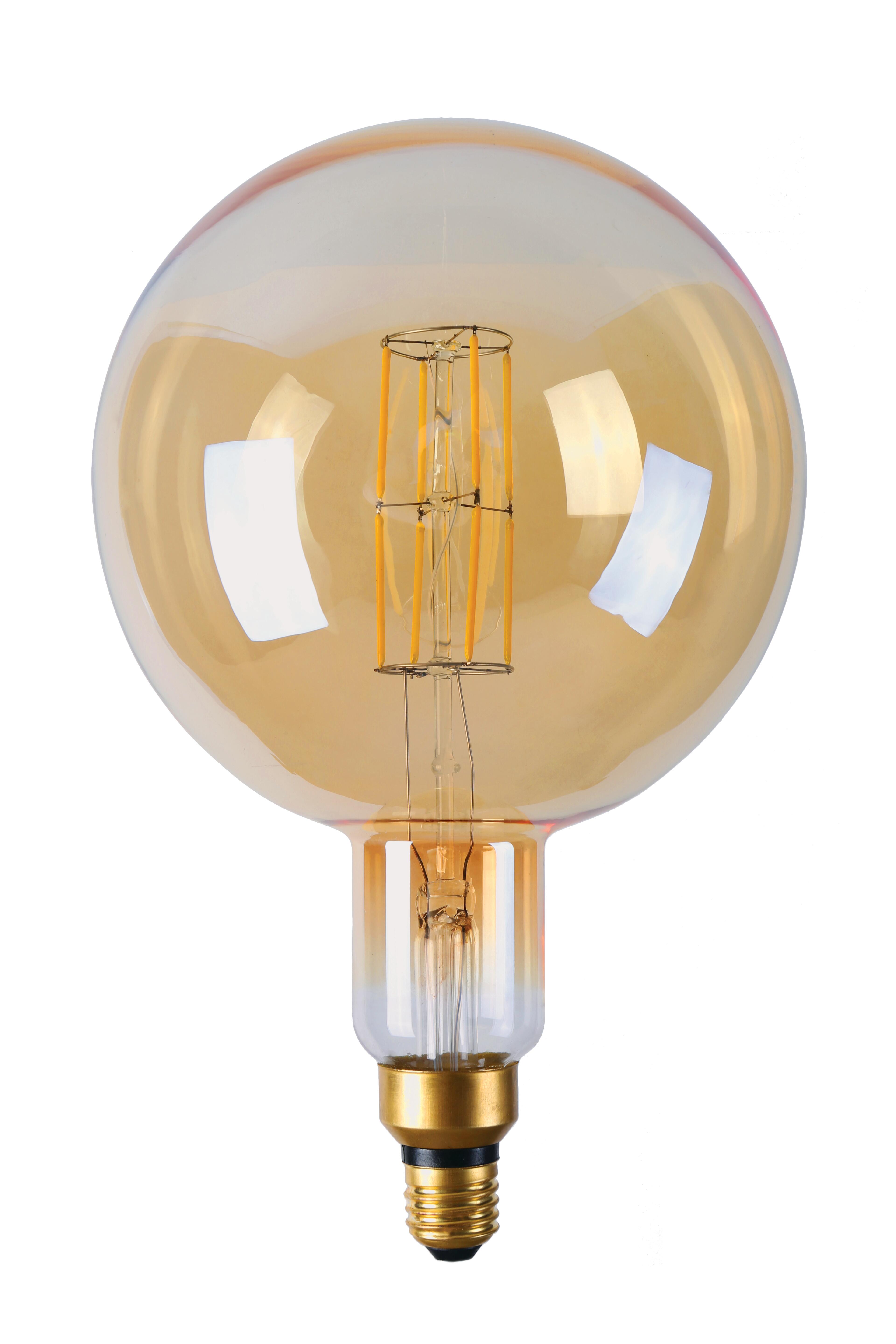 Ampoule E27 LED Filament. Verre ambré, 6.5W Lumière Chaude 2700K, 806 lumens (équivalent 60W). Forme G200. Globe de diamètre 20cm. Idéal pour équiper vos luminaires et apporter une ambiance chaleureuse à votre intérieur.