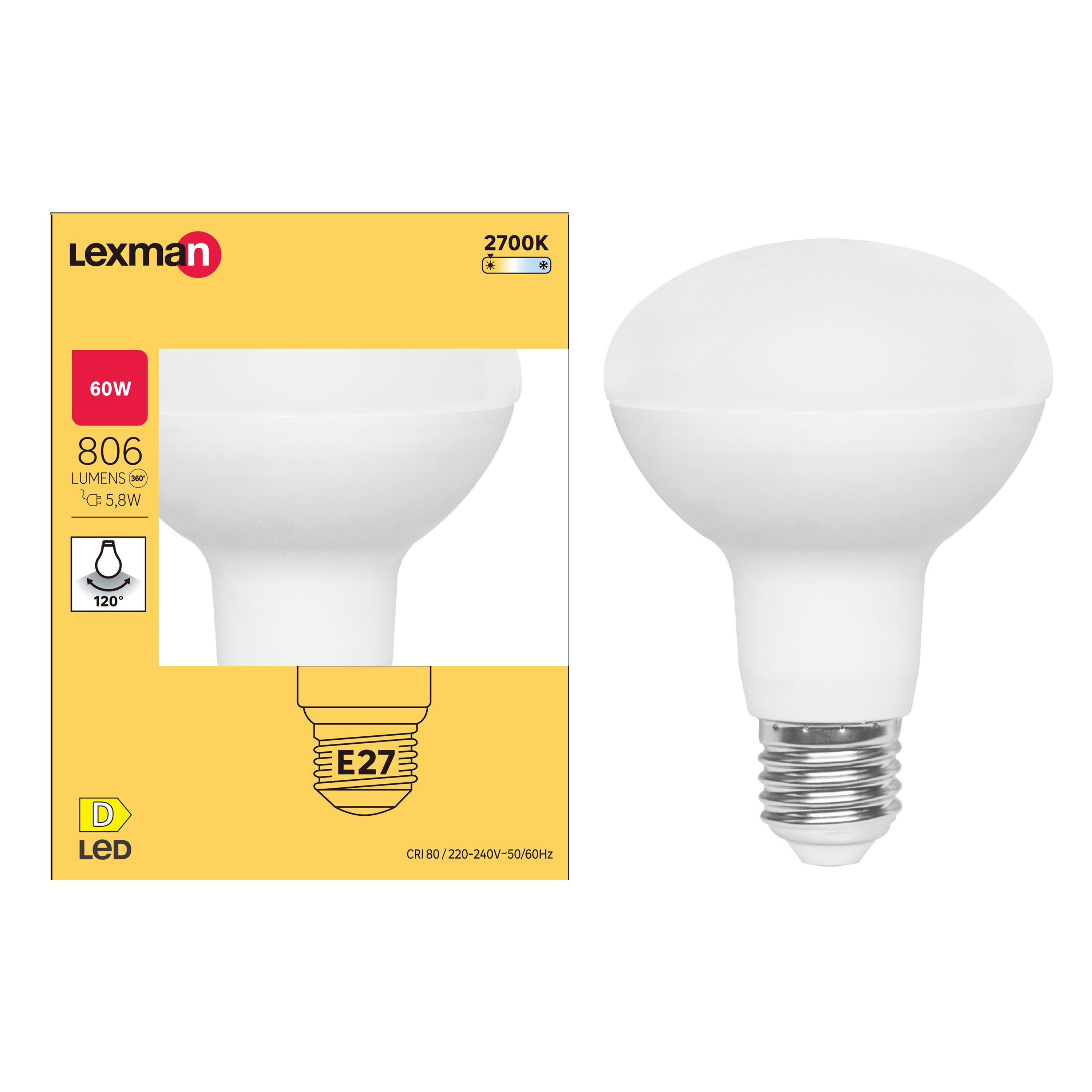 Ampoule led, réflecteur E27, 806lm = 60W, blanc chaud, LEXMAN