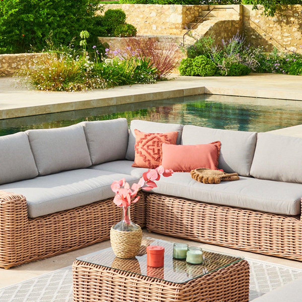 Dès l'arrivée du beau temps, profitez de votre espace extérieur avec le fauteuil d'angle "SAVINIA" Hespéride.