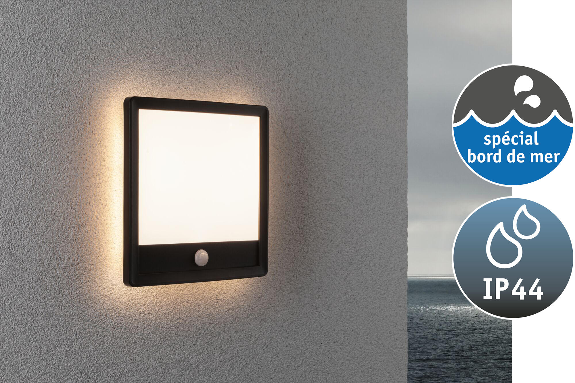 Les luminaires d’extérieur situés près de la côte sont exposés à des conditions environnementales plus sévères que ceux situés à l’intérieur des terres. La teneur en sel de l'air attaque plus fortement les métaux et les matières plastiques Fabriqué en plastique de haute qualité, le panneau extérieur Lamina de dimensions 250x250mm ne se corrode pas à proximité de la mer. Avec sa surface intérieure blanche et son cadre noir, le panneau carré diffuse un agréable éclairage blanc chaud étendu sur les murs comme au plafond. Un rétroéclairage supplémentaire crée une atmosphère agréable et met particulièrement en valeur le mur/plafond. Le détecteur de mouvement veille à ce que la lumière s'allume automatiquement dès que quelqu'un s'en approche dans l'obscurité. Les différentes fonctions du détecteur de mouvement sont réglables par l’interrupteur du luminaire.