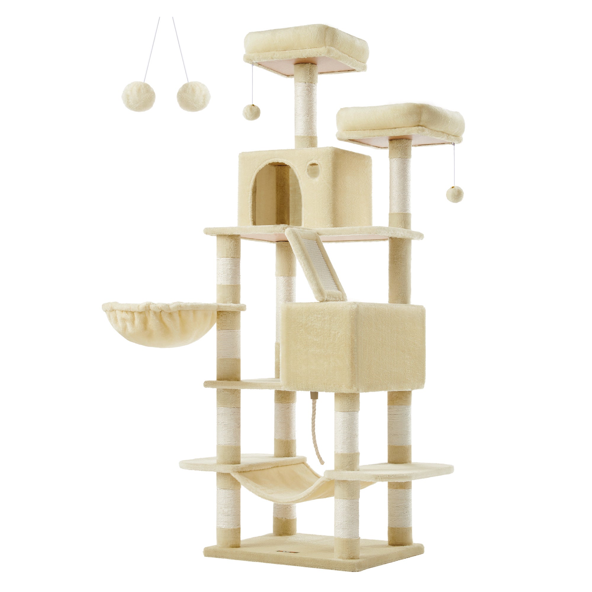 Arbre à Chat, Hauteur 168 cm, avec 13 Griffoirs, 2 Plate-forme, 2 Niches, Panier, Hamac, Pompon, Tissu Peluche, Beige