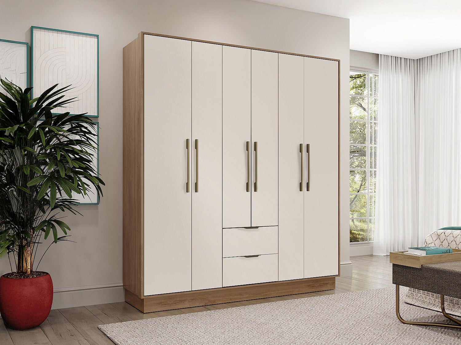 Armoire 6 portes et 2 tiroirs - L162 cm - Coloris : Beige et naturel - FEOVA