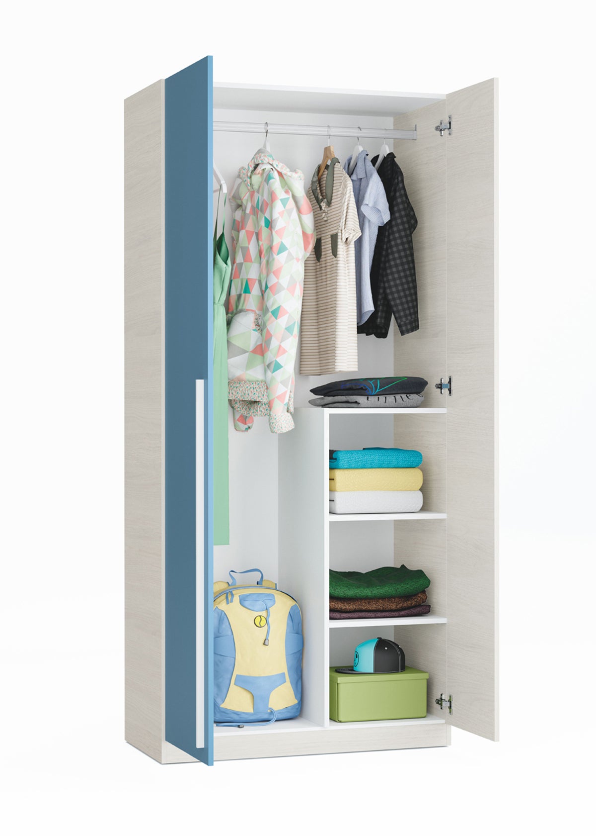 Armoire avec 2 portes coloris Blanc Alpes et bleu jeune avec poignées en métal. Comprend 3 cintres inférieurs et espace libre pour les boîtes à chaussures ou les sacs à dos. Dimensions: 200 x 90 x 52 cm. Matière: mélamine. Couleur: Blanc Alpes et bleu