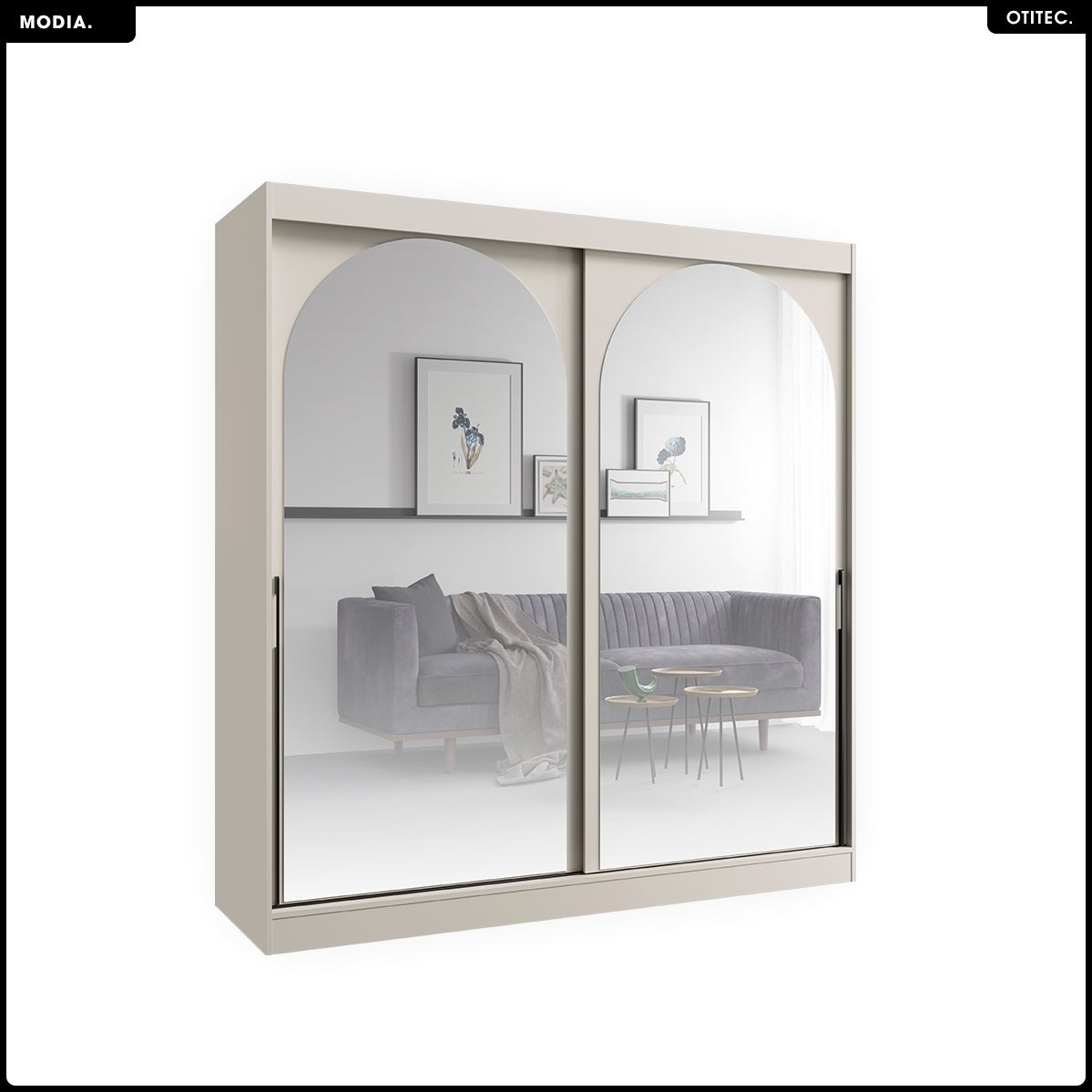 • Design scandinave et intemporel : Finitions cachemire mat, lignes épurées et façades miroir à arches douces. MODIA affirme un style à la fois sobre et distinctif, qui structure la pièce tout en l’illuminant.