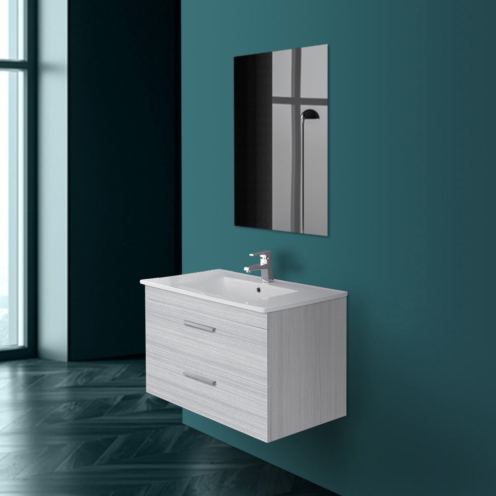 Coiffeuse de salle de bain suspendue 81x50 cm gris 2 tiroirs à fermeture progressive complète avec lavabo en céramique blanc brillant et miroir réversible 60x80 cm