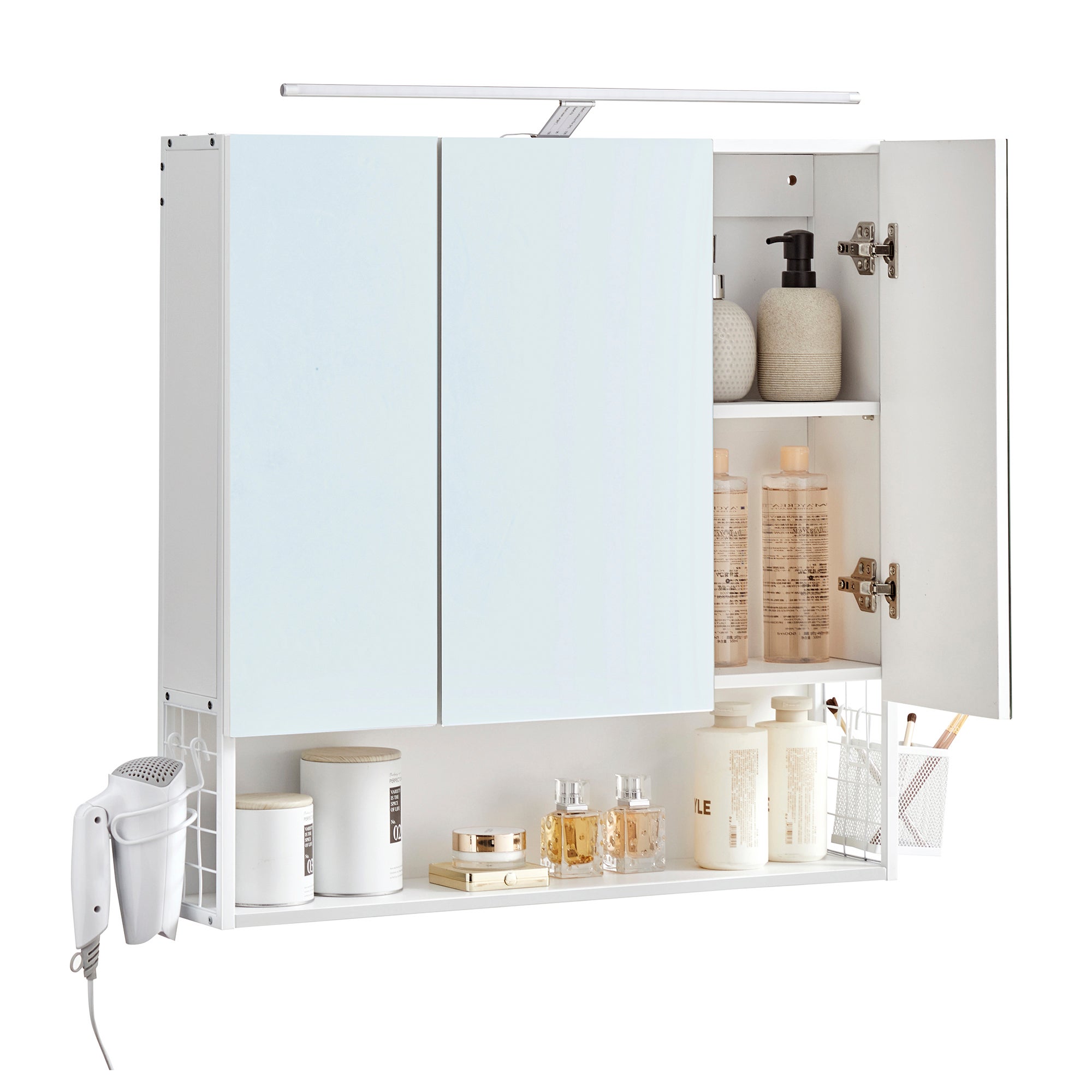 Armoire Murale avec Miroir, avec Lampe LED, avec Câble, Placard 3 Portes, Étagère Réglable, Porte Sèche-Cheveux, Pot, Moderne Chic, Blanc