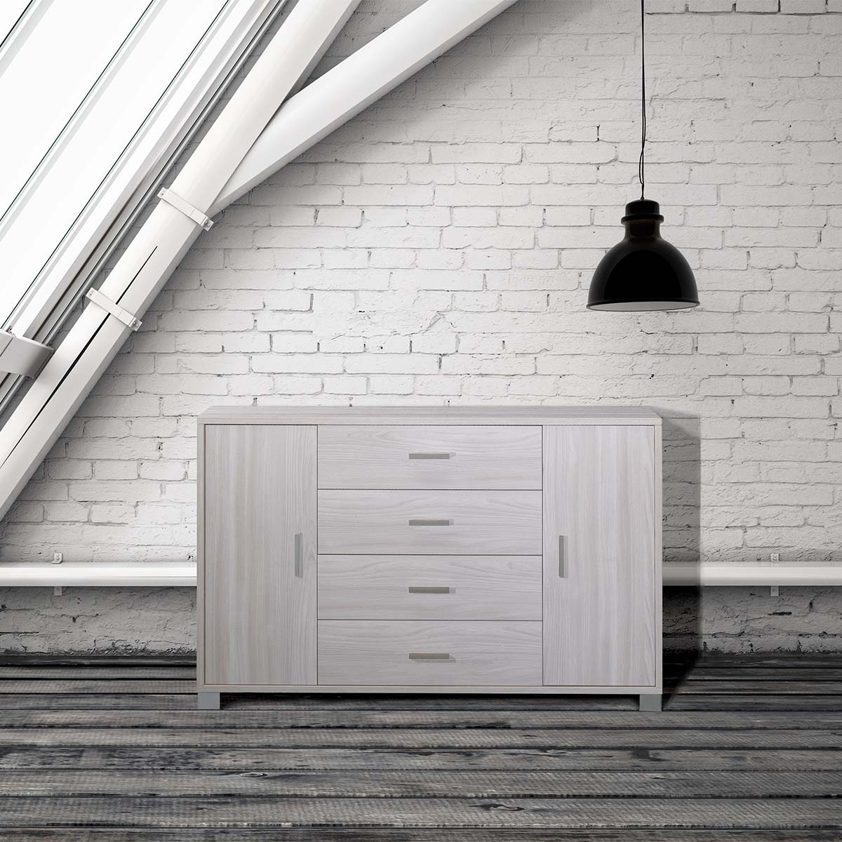 Cadre de 18 mm d'épaisseur, portes et tiroirs de 16 mm d'épaisseur, chants en ABS. Guidage des tiroirs par roulettes. Peut accueillir 2 étagères réglables. Poignées et pieds peints en chrome satiné (bruni avec structure Oxide ou Titane ; structure et façades en ciment). Meuble en kit.