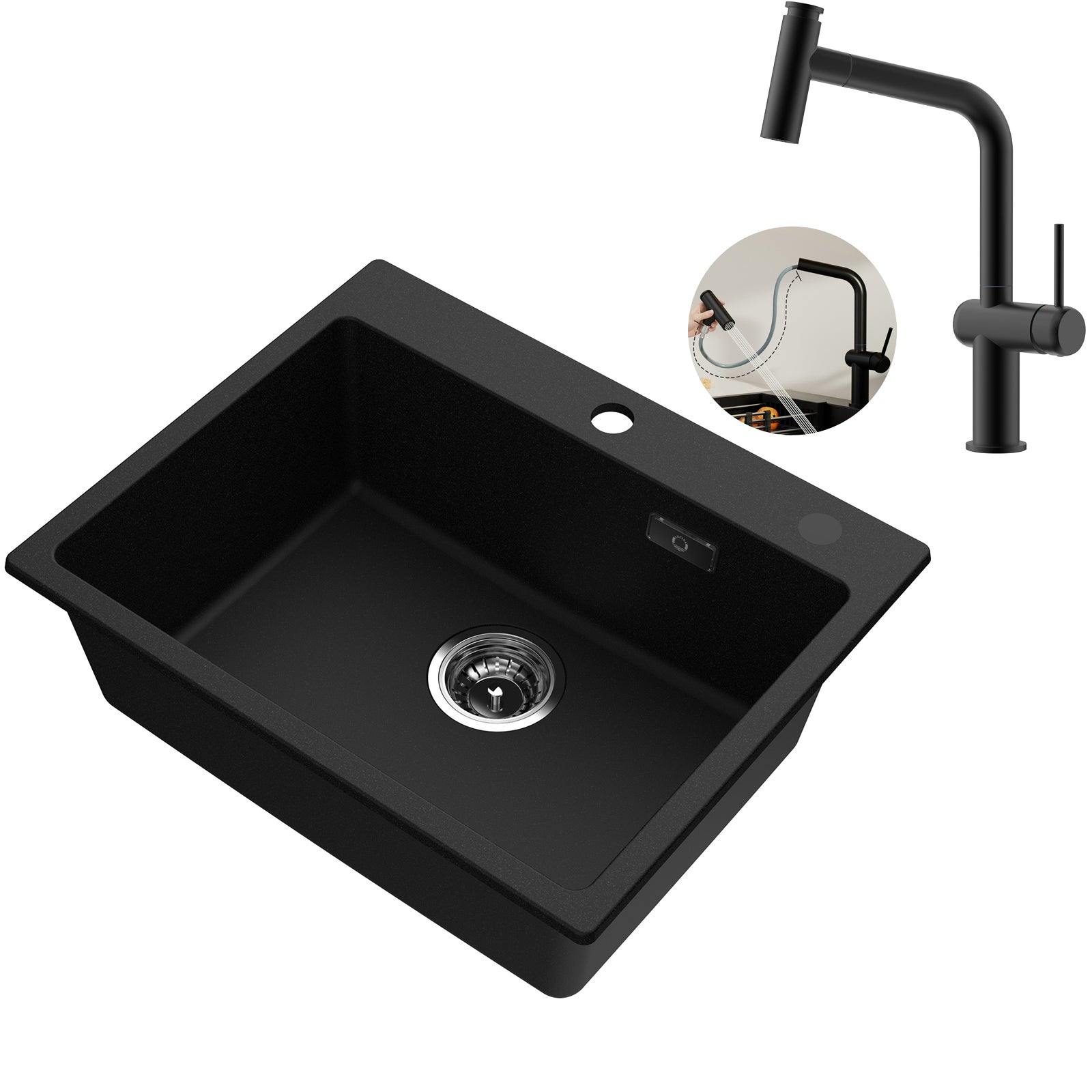 AuraLum Max 1 Bac Évier Cuisine en Granit,55*45*20cm,Kit de Vidage,Noir+Robinet de Cuisine avec Douchette Extractible Rotatif 360 °2 Fonctions, Barboteur démontable,Noir
