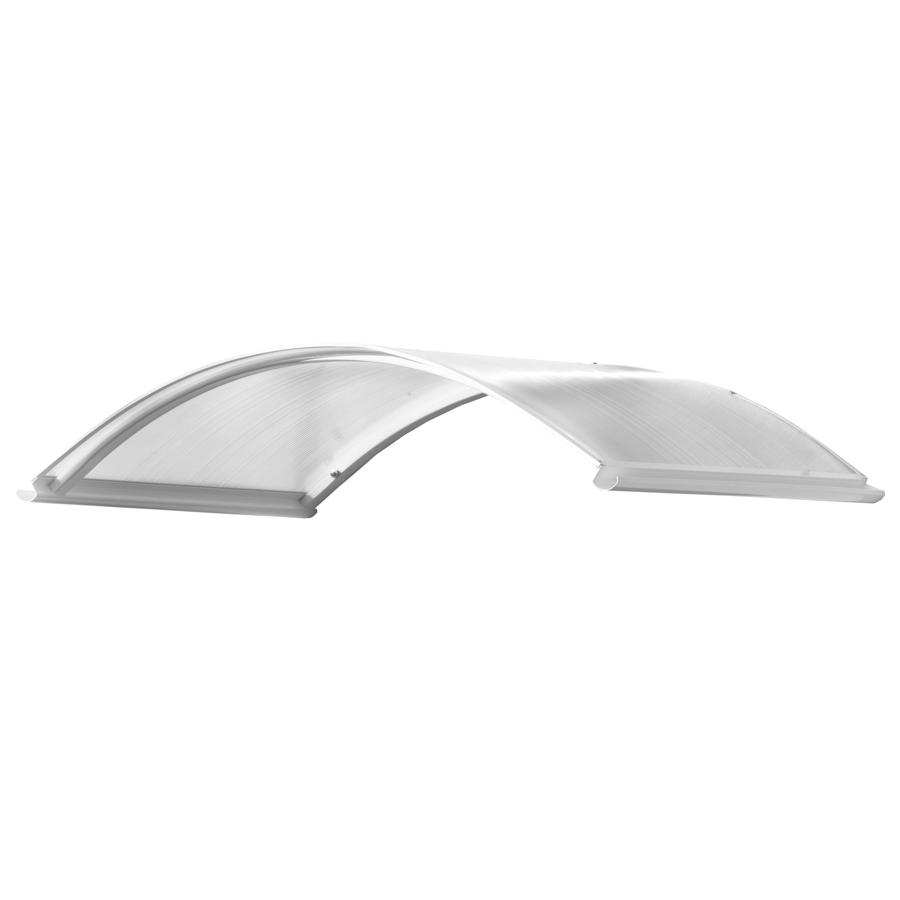 Auvent en forme d’arc, équipé de gouttières d’évacuation d’eau et d’un joint coté mur évitant les écoulements d’eau sur la façade. Construction en aluminium recouvert de peinture ayant subi un traitement thermique. Plaque en polycarbonate alvéolaire avec filtre UV des deux côtés. Caractéristiques En forme d’arc, une construction forte et compacte, les matériaux utilisés permettent de se servir du produit pendant plusieurs années même dans un milieu salin. Assemblage très facile, l’auvent étant prémontré il suffit de visser les profilées en arc à la couverture et fixer au mur. Les fournitures de montage, vis et joints ainsi que le mode d’assemblage, sont inclus. Vu la construction de la plaque en polycarbonate alvéolaire, la condensation de la vapeur d’eau est possible dans des „couloirs” dans des conditions désavantageuses. Ce phénomène physique ne présente pas de défaut de l’auvent.