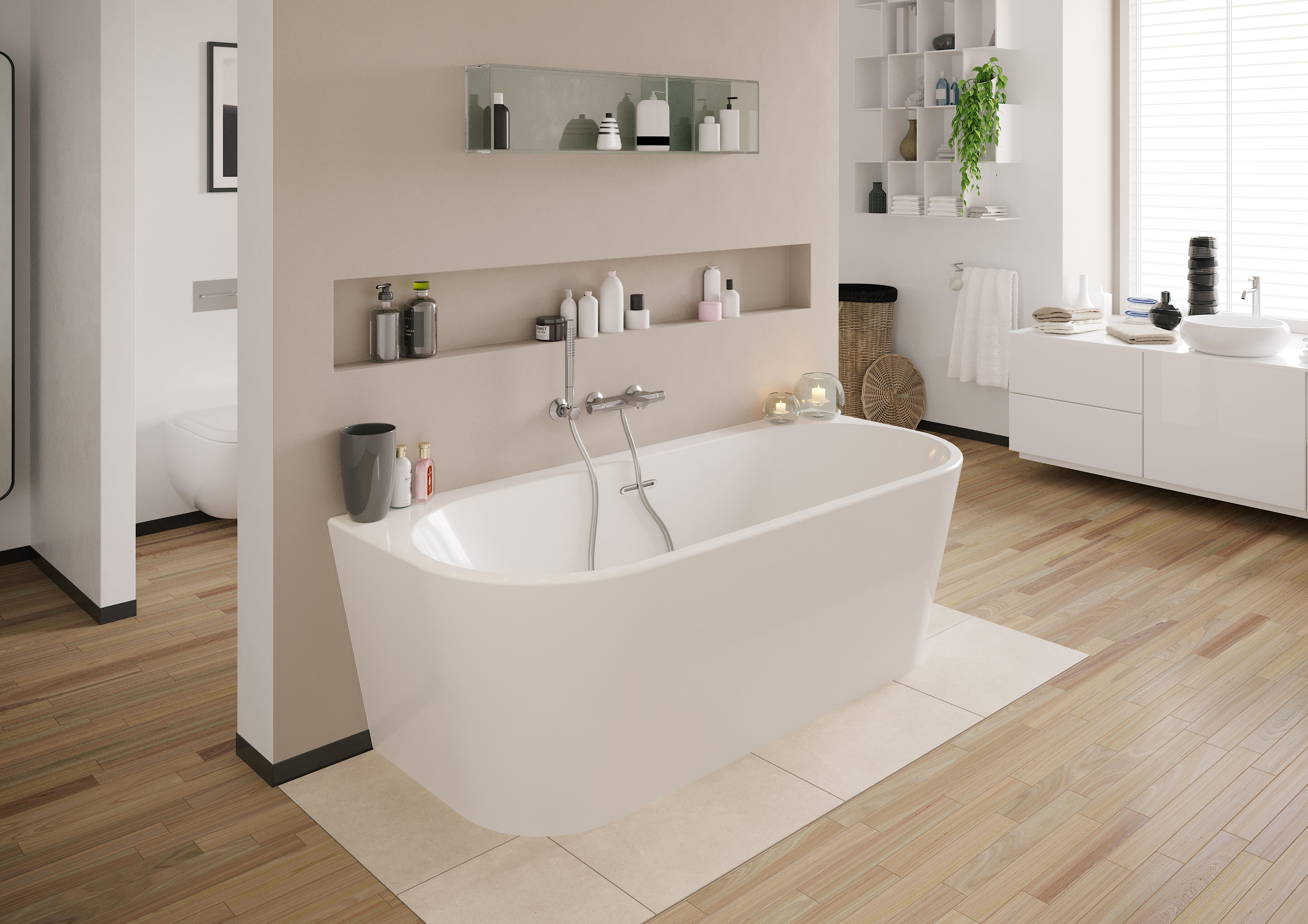 Baignoire semi-ilot à poser contre 1 mur, structure monobloc avec habillage en acrylique intégré permet d'avoir l'esthétique d'une baignoire îlot et la facilité d'installation grâce à la pose murale. Acrylique thermoformé 3.5mm, renforcé avec de la résine et fibre de verre: facile d'entretien, résiste au choc et agréable au toucher. Vidage inclus et système de vidage « pop-up » intégré pour vider l’eau du bain d’une simple pression.