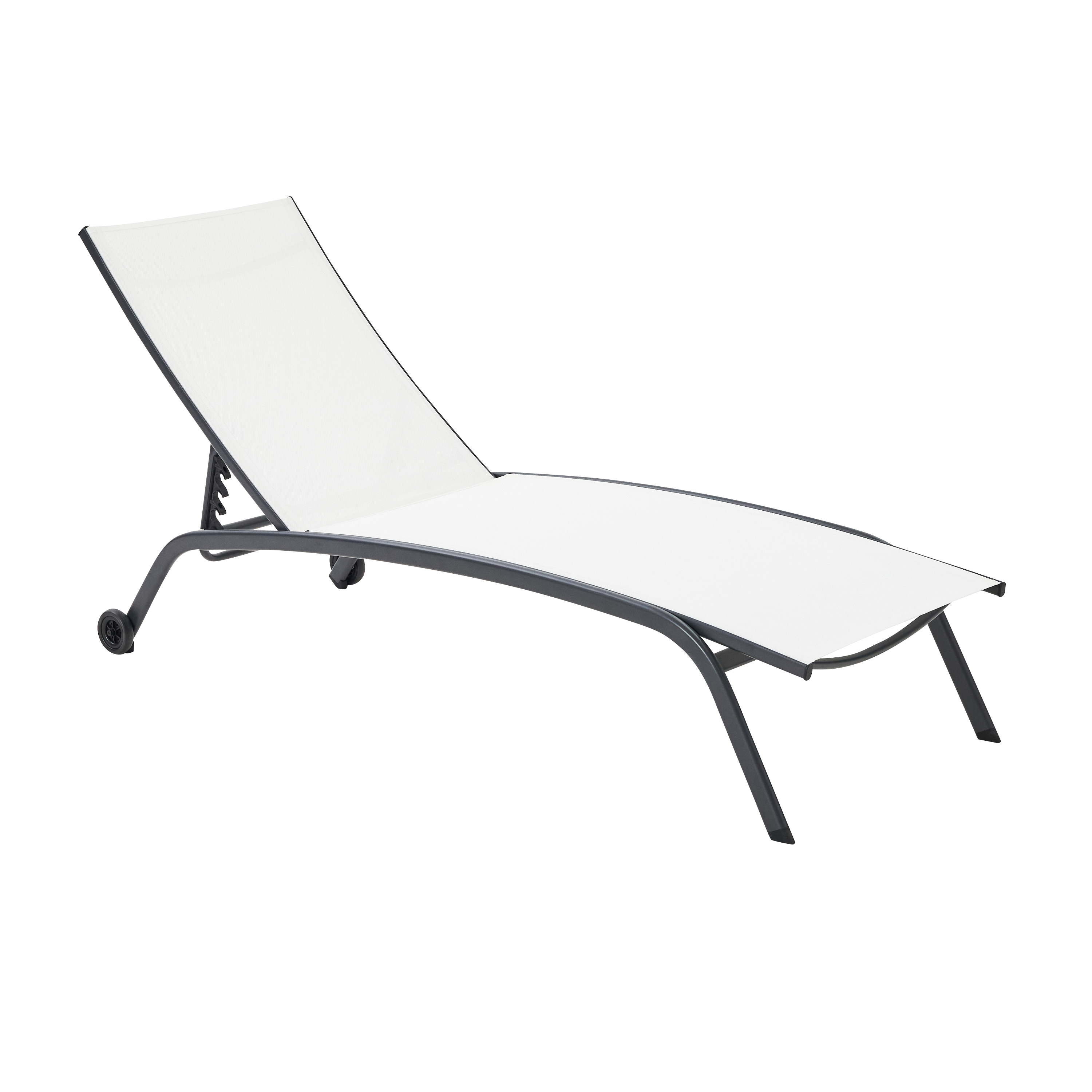 "Détendez-vous sur le transat Rivera Dotée d’un revêtement en textilène, la chaise longue Rivera vous assure un confort optimal. Ce tissu est souple et suit les courbes de votre corps pour des après-midi au soleil en tout confort. Son dossier réglable vous offre quatre positions différentes pour s’ajuster à vos envies. Conçue avec des matériaux légers et résistants, cette chaise longue est le bon compromis entre confort et utilité. Sa structure en acier la rend légère et facile à déplacer grâce à ses roulettes. Son textilène laisse passer l'air et l'eau, et sèche rapidement après une petite pluie. Un design modern et géométrique Les lignes courbes de la série Rivera invitent à la détente, en épousant les formes de votre corps. Ce bain de soleil ajoutera une touche design à votre terrasse ou jardin. Il est disponible en 4 coloris, vous permettant de mixer les teintes selon vos envies. Des matériaux faciles d'entretien Pratique au quotidien, le nettoyage de la chaise longue se réalise simplement à l’aide d’un chiffon humide et d’un produit neutre. Afin de préserver votre mobilier, veillez à le couvrir lors de longues périodes d’inutilisation pour le protéger des salissures et des intempéries. En cas de point de corrosion, veillez à utiliser immédiatement un traitement anti-rouille afin d’éviter qu’il ne se propage. Réparable, des pièces détachées sont disponibles pour prolonger la durée de vie de votre mobilier. "