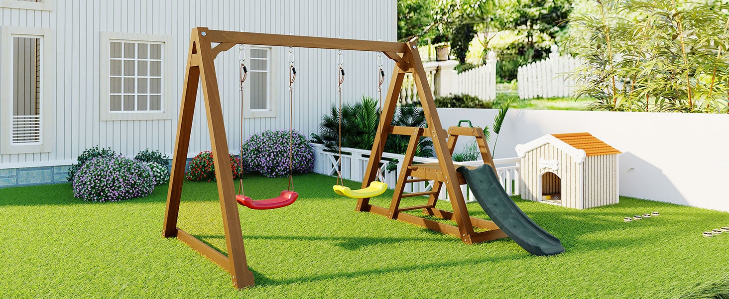 Balançoire double pour enfants avec toboggan + échelle | Structure en bois massif d'extérieur | 238x240x168 cm