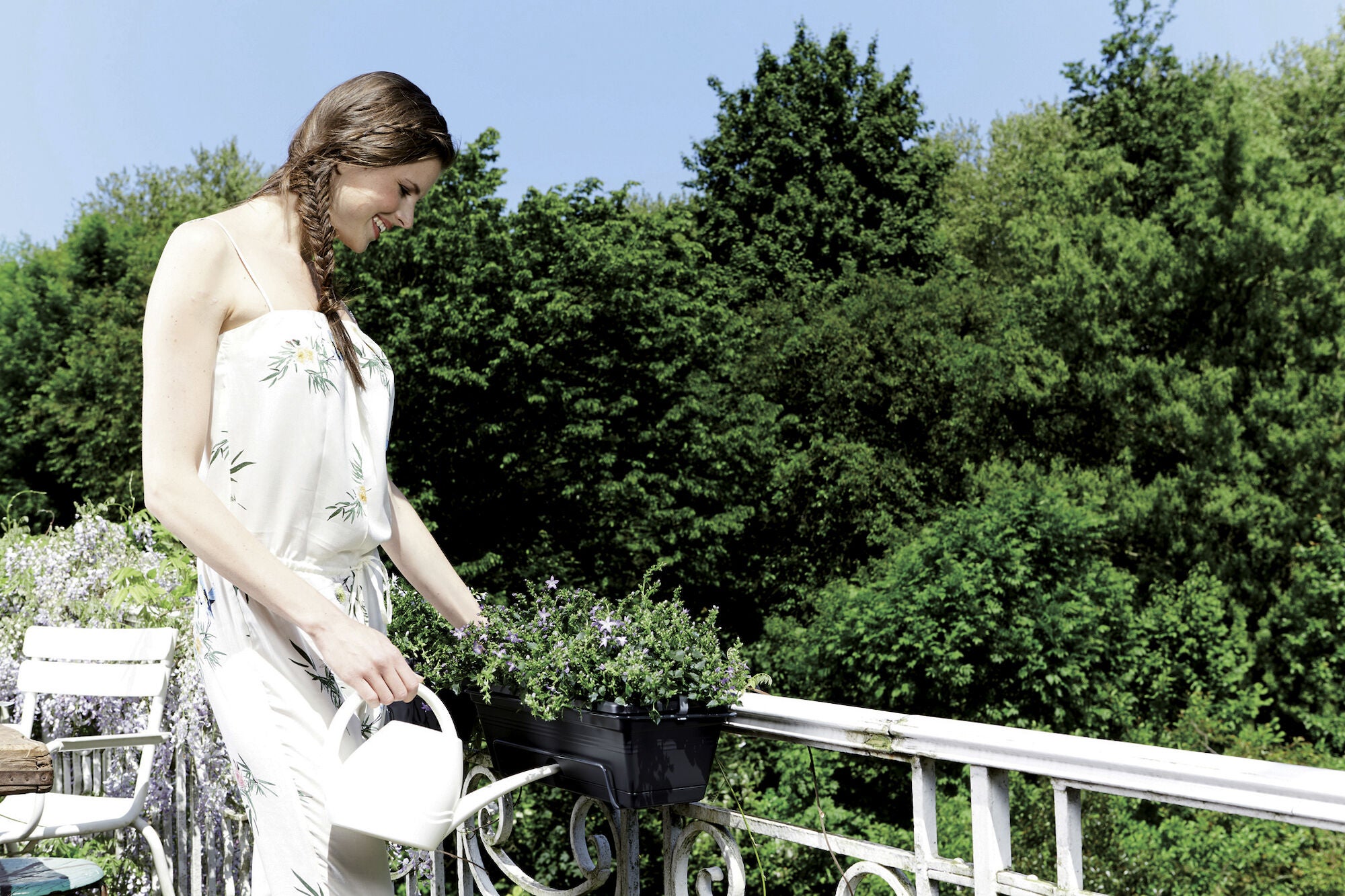 Une balconnière classique en plastique recyclé avec son support en métal, tout en un ! La jardinière permet un arrosage facile par l'ouverture à l'avant. En cas de forte pluie, l'eau s'écoule dans la soucoupe. Profitez de vos fleurs sur le balcon n'a jamais été aussi facile. Astuce : pour le choix des plantes, tenez compte de l'ensoleillement du balcon. Clips en plastique inclus pour que la jardinière reste bien accroché. Cette balconnière convient à des balustrades de 6 cm de large maximum. Fabriqués à base de plastique recyclé, fabriqués grâce à l’énergie éolienne, 100% recyclable.