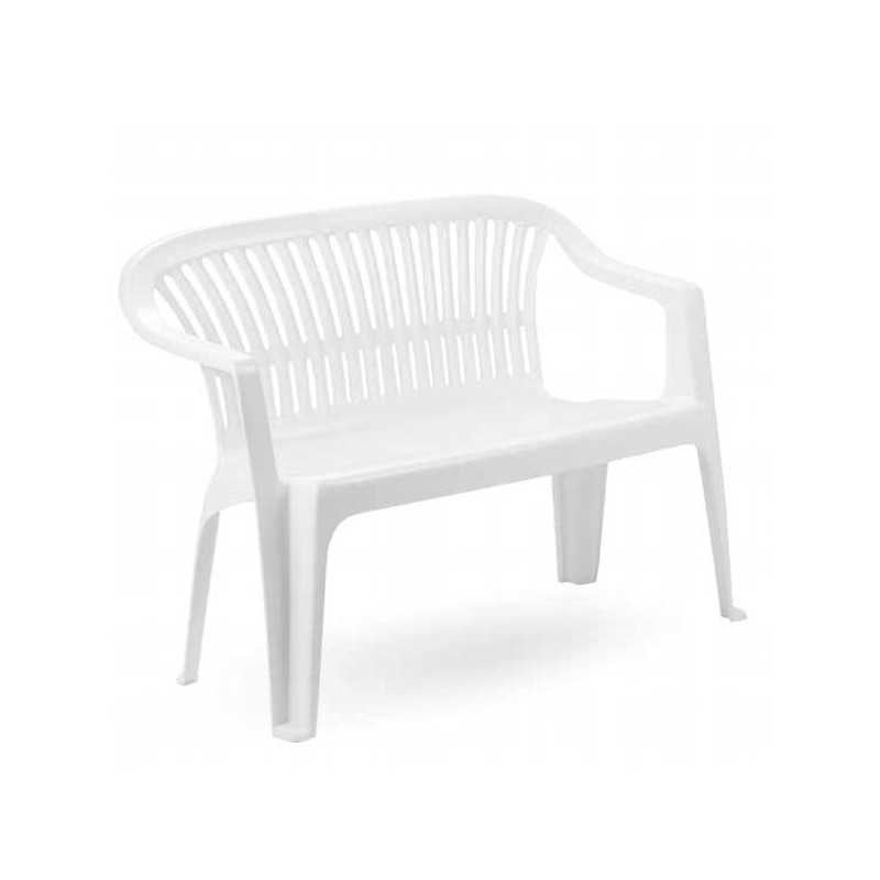 Banc de jardin en résine monobloc blanche, 100% recyclable, résistant aux agents atmosphériques, moisissures, smog et poussière. Équipé d'accoudoirs et de quatre pieds, il est empilable et adapté aux surfaces qui ne sont pas parfaitement lisses. Avec des dimensions de 114x55x82 cm et un poids de 6,4 kg, il n'est pas adapté à un usage professionnel. Modèle Diva, marque Progarden