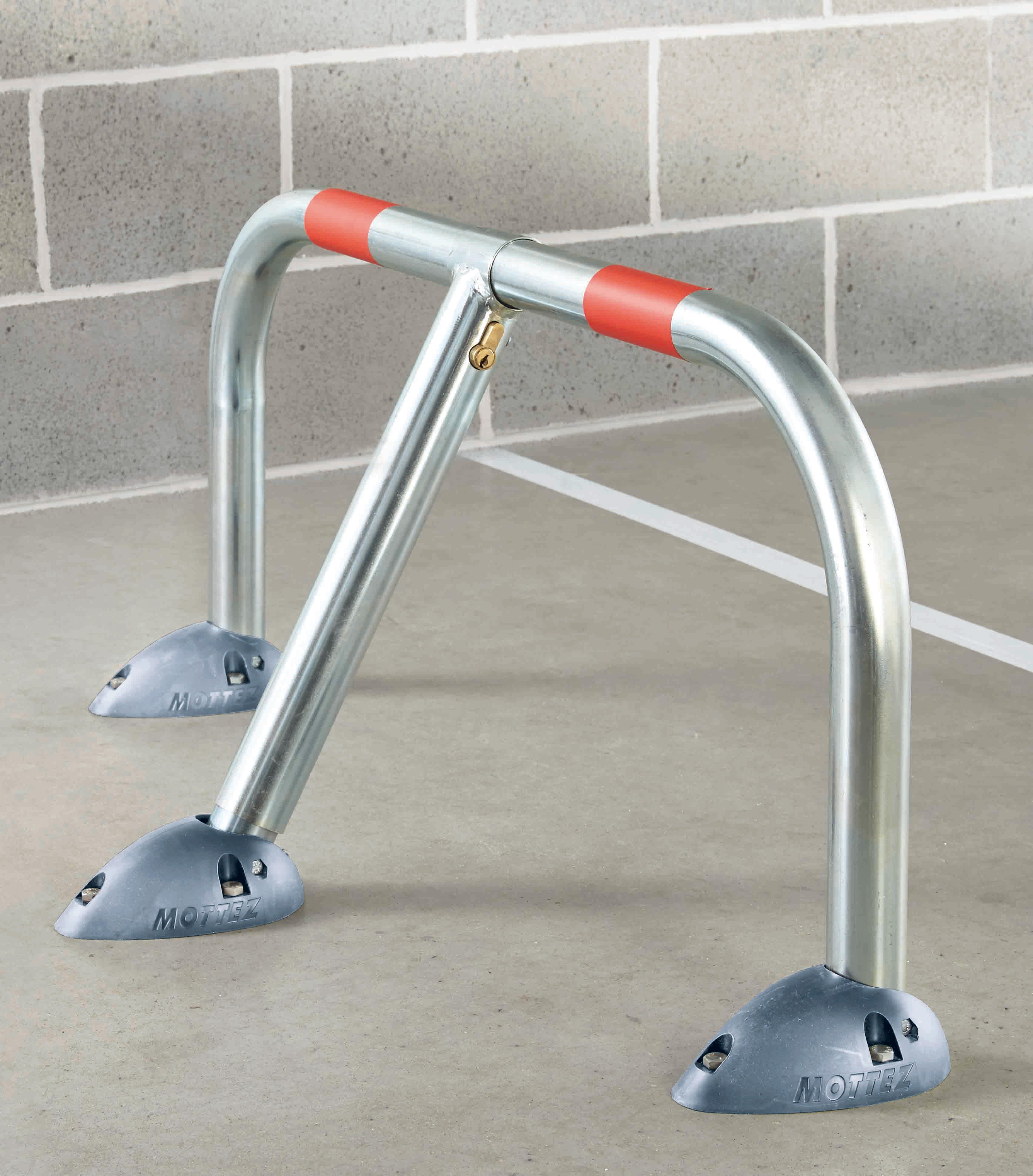 Barrière rabattable DESIGN avec embases en résine super résistantes (résiste à 10 tonnes de compression) Sans aspérité pour sauvegarder les pneus Structure en tube Ø 50 et 45 mm 3 embases design en résine haute résistance + 2 bandes fluo rouges Fermeture cylindre européen. La visserie n'est pas fournie. Pour une bonne pose, il faut utiliser des chevilles et vis à béton avec les diamètres et longueurs associées à votre support (voir notice).