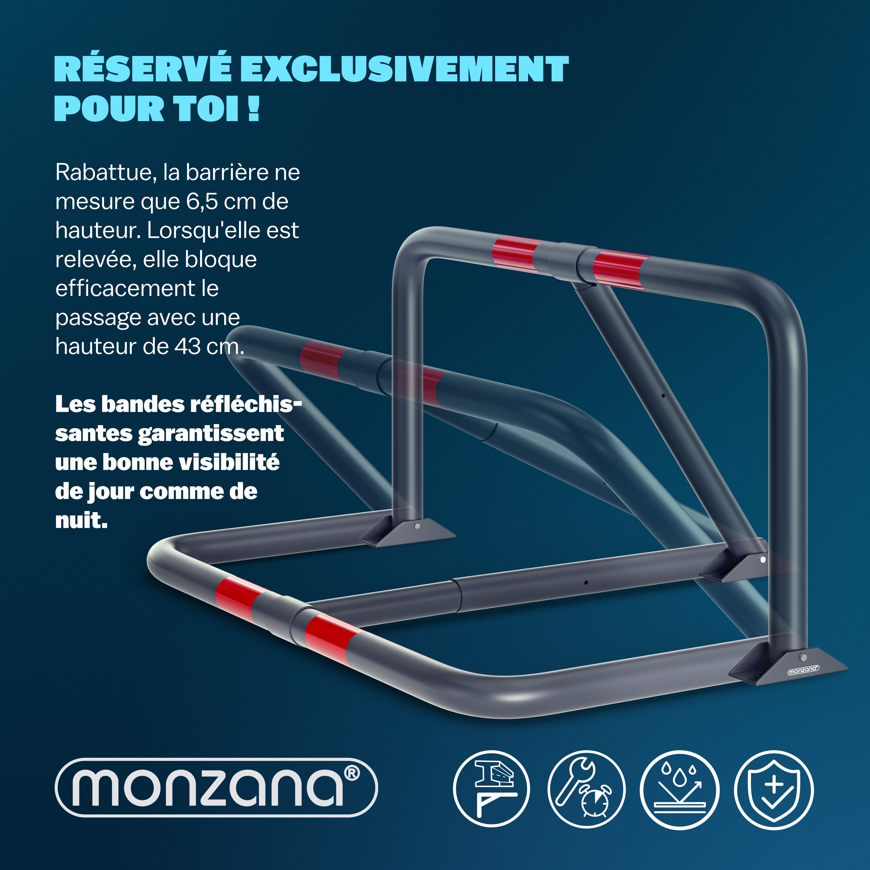 Voir les produits de la même catégorieLa protection efficace contre le stationnement abusif ! Fini le stress et les montées de tension à cause des voitures indésirables ou des invités non conviés sur vos chemins privés ! Avec Monzana, vous sécurisez efficacement votre propriété en quelques gestes simples. La barrière de parking Monzana en acier massif thermolaqué protège vos places de parking, allées privées et entrées contre les véhicules non autorisés. RELEVER & VERROUILLERLe point central de cette construction est l’arceau en acier robuste, qui se plie et se déplie aisément. Le cadre et la barre de soutien sont solidement fixés au sol en trois points, garantissant une grande stabilité et sécurité. Un cadenas fourni avec trois clés permet de verrouiller la barrière en position verticale. ROBUSTE & RÉSISTANT AUX INTEMPÉRIESFabriquée en acier thermolaqué résistant aux intempéries, la barrière de parking est équipée de quatre bandes réfléchissantes, la rendant parfaitement visible même dans l’obscurité. INSTALLATION SIMPLE & RAPIDETout le matériel de fixation, le cadenas et les clés sont inclus. La plaque de fixation est pré-percée, permettant une installation facile sur un sol solide à l’aide des 6 ancres fournies. Avantages du produit : Idéale pour bloquer l'entrée d'une place de parking ou d'une allée Pliable Verrouillable Construction en métal robuste garantissant une longue durée de vie Fournie avec des vis et 6 ancrages de sol, un cadenas avec 3 clés, et une plaque de sol pré-percée Bonne visibilité grâce aux bandes réfléchissantes, même la nuit Caractéristiques techniques : Dimensions barrière relevée (H x P) : 76,5 x 43 cm Diamètre du tube : 4 cm Poids : 4,5 kg Couleur : Gris mat Contenu de la livraison : 1x Barrière de parking Cadenas avec 3 clés Plaque de sol pré-percée Matériel de fixation (6 ancrages de sol)
