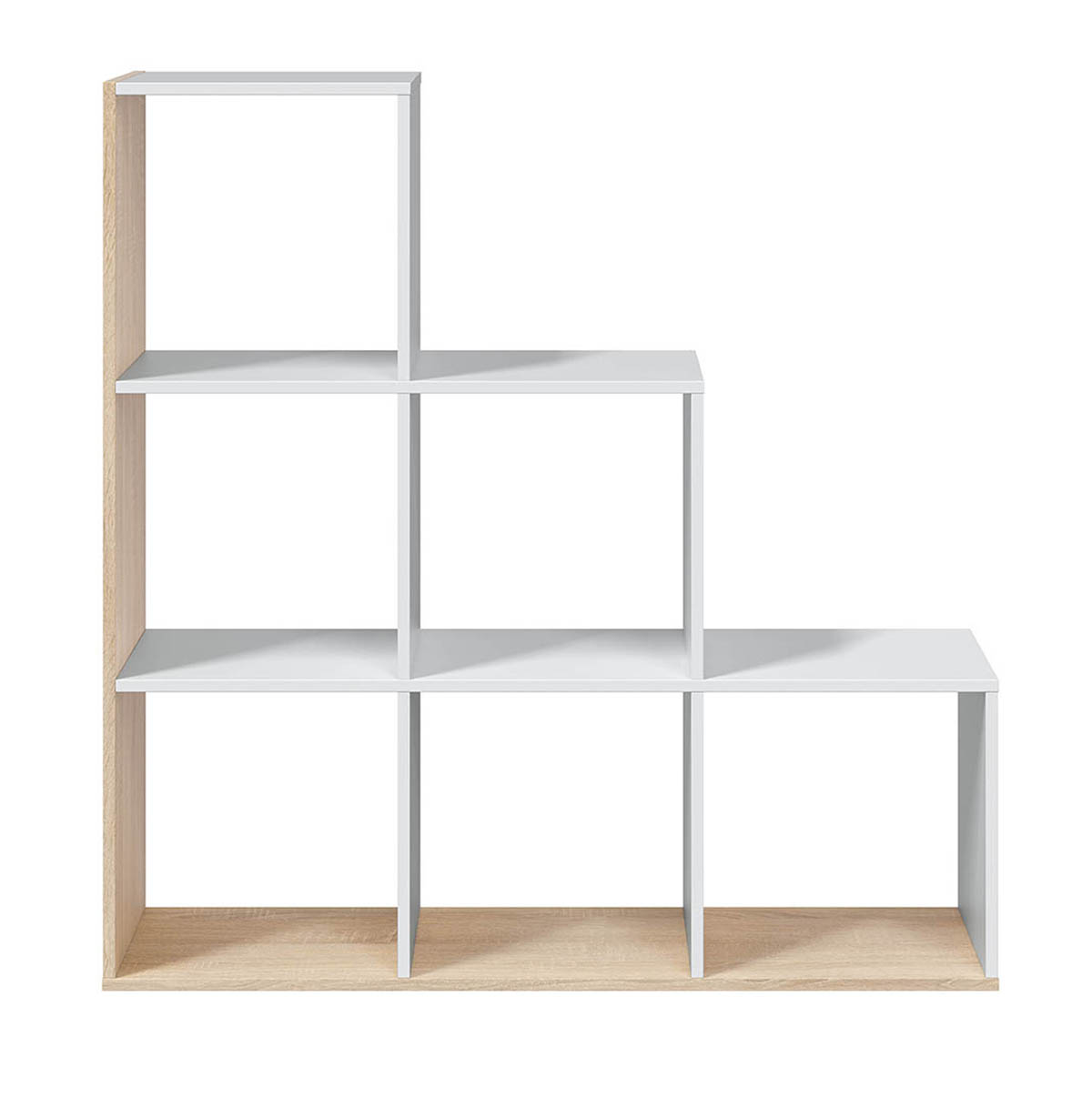 Cette bibliothèque en escalier est parfaite pour y placer des objets de décorations, livres, CD ou DVD. Avec ses couleurs blanche et chêne, elle est à la fois discrète et imposante. Fabriqué en panneau aggloméré haute densité avec finition mélamine de qualité (matériau ayant une surface non poreuse et très résistante). Elle est composée de 6 compartiments et de 3 plateaux. Elle peut être installée dans n’importe quelle pièce ; un salon, une entrée, une chambre. Dimensions : Hauteur 110 x Longueur 108 x Profondeur 28 cm. Coloris : chêne candien / blanc artic. Poids : 20 kg. Produit de fabrication Espagnol certifié PEFC.