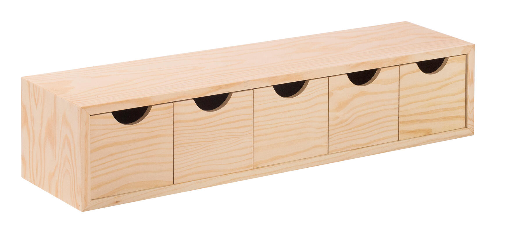 Commode en bois de pin massif naturel avec 5 tiroirs. Dimensions : 57 x 13 x 12,2 cm (largeur x hauteur x profondeur).