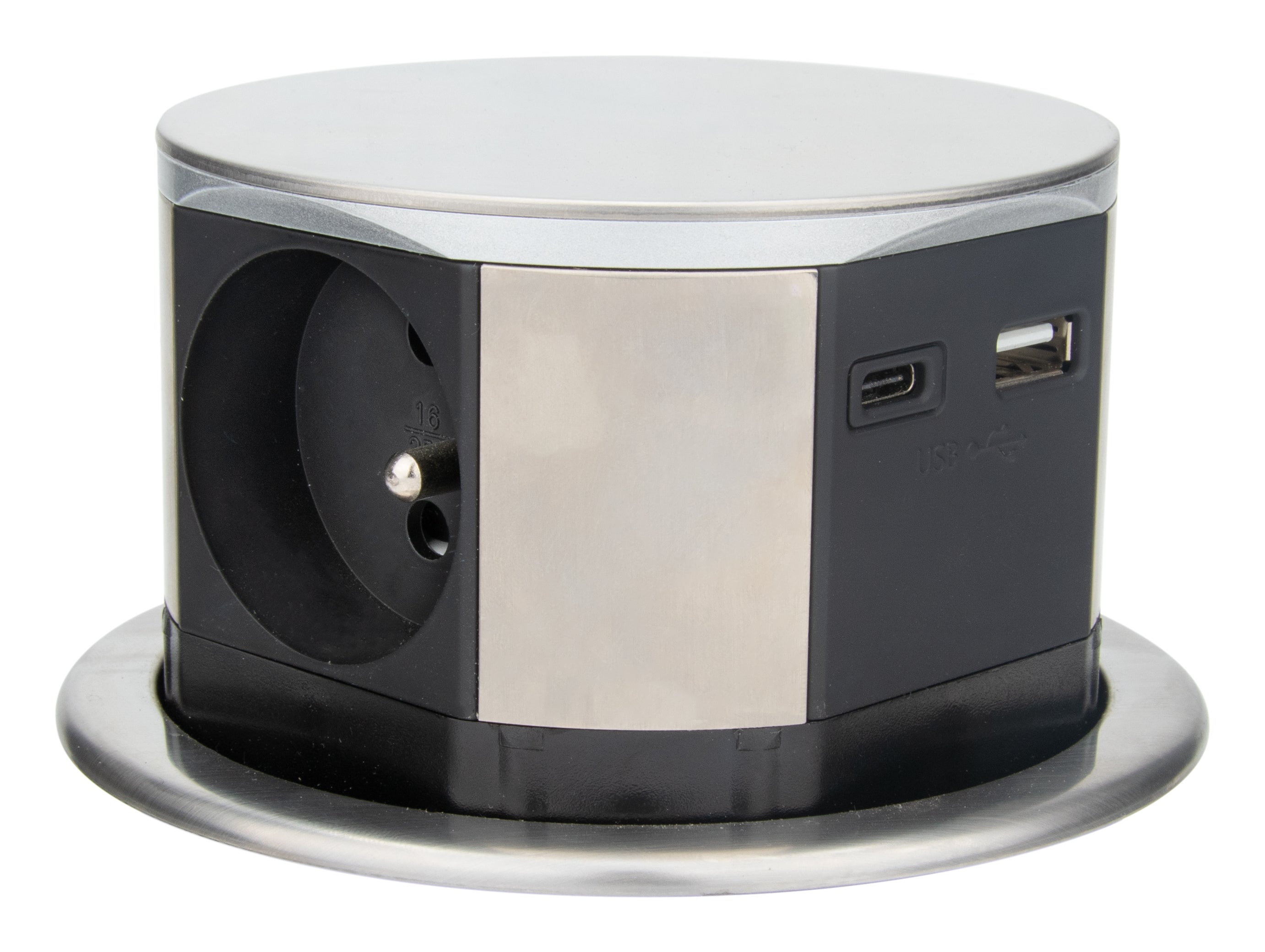 Bloc encastrable en plusieurs coloris pour cuisine et bureau équipé de toutes les prises nécessaires. Compacte et facile à installer, cette prise encastrable est équipée d'un système d'ouverture automatique par simple pression. Son faible encombrement permet de l'installer sans contrainte de place sous le bureau ou sur le plan de travail dans un trou de diamètre Ø100mm. S'installe à l'aide d'une scie cloche ou d'un trépan mais également à l'aide d'une simple perceuse grâce au gabarit de pose fourni (bague de fixation). Câblée en H05VV-F 3G1,5mm² de longueur 1,5m. Puissance max 3680 W sous 230 W. Dimensions du produit ouvert : Ø 16 x 11.5 cm. Dimensions du produit fermé (prises non visibles) : Ø 10.3 x 11.5 cm.