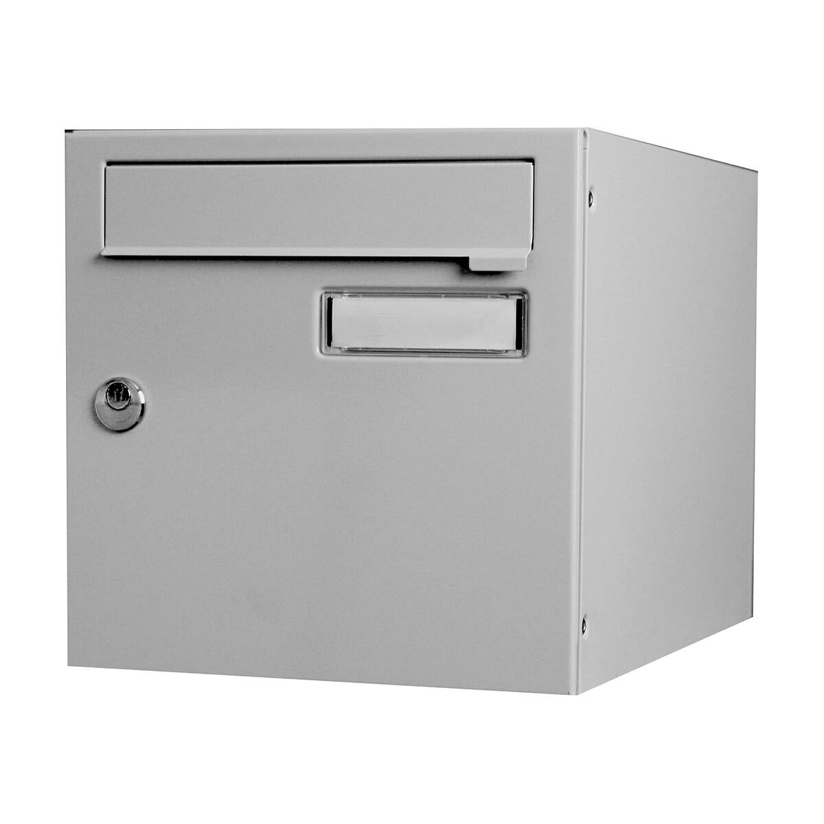 Boite aux lettres normalisée en acier revêtu métal, garantie anti-corrosion 3 ans. Poudre polyester, coloris gris, RAL 7035. Anti‐vandale grade 2, arrachement supérieur à 15 kg. Boitier avec gouttière hydrofuge, porte recouvrante avec volet en acier équipée d’un porte‐nom affleurant en polycarbonate. 1 porte, dimensions : 285 x 285 x 385 mm.