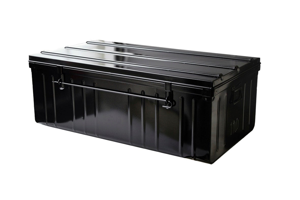 En tôle TC de premier choix, laquée au four, renforcée par 2 raidisseurs sur le couvercle. Avec poignées rabattables en fil d'acier, sur les cotés. Système de fermeture avec tringle pouvant accueillir un cadenas